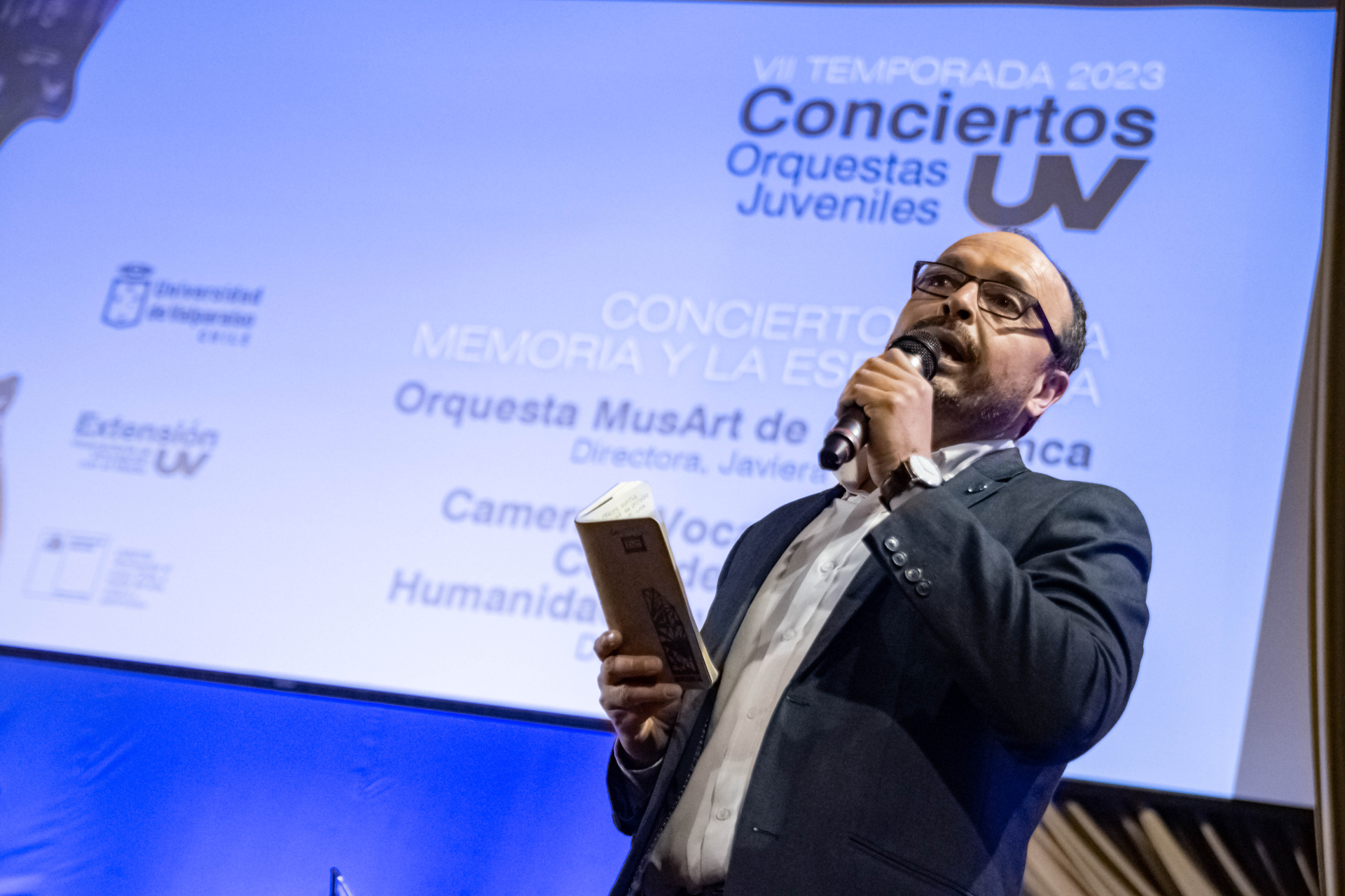 El rector Osvaldo Corrales destacó el papel de la música en la memoria histórica y emotiva de los pueblos: “Nos parece que el arte juega un rol muy especial en la construcción de la memoria, pero también de la memoria emotiva de los pueblos, y es por eso que hoy día la Orquesta MusArt y la Camerata nos interpretan una selección de temas, que corresponden a la música popular, pero de autores que fueron víctimas de la represión durante el Golpe de Estado. Para nosotros, forma parte de este conjunto de actividades que estamos realizando en el marco de la conmemoración de los 50 años del Golpe y hemos invitado a toda la ciudadanía. Estamos muy contentos, muy gratificados, por el marco de público que estamos teniendo en esta actividad y también en este concierto, que forma parte de los ciclos de conciertos de Orquestas Juveniles, que ya la Universidad viene organizando hace varios años”.