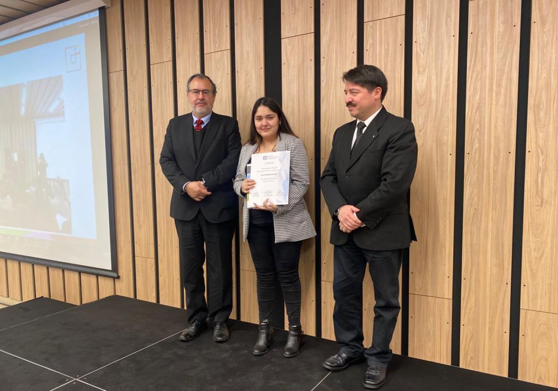 En la fotografía, Camila Adriazola junto al director de la Escuela de Ingeniería Industrial de la UV, Daniel Miranda, y el presidente del Consejo de Especialidad Industrial del Colegio de Ingenieros, Rodrigo Escudero.