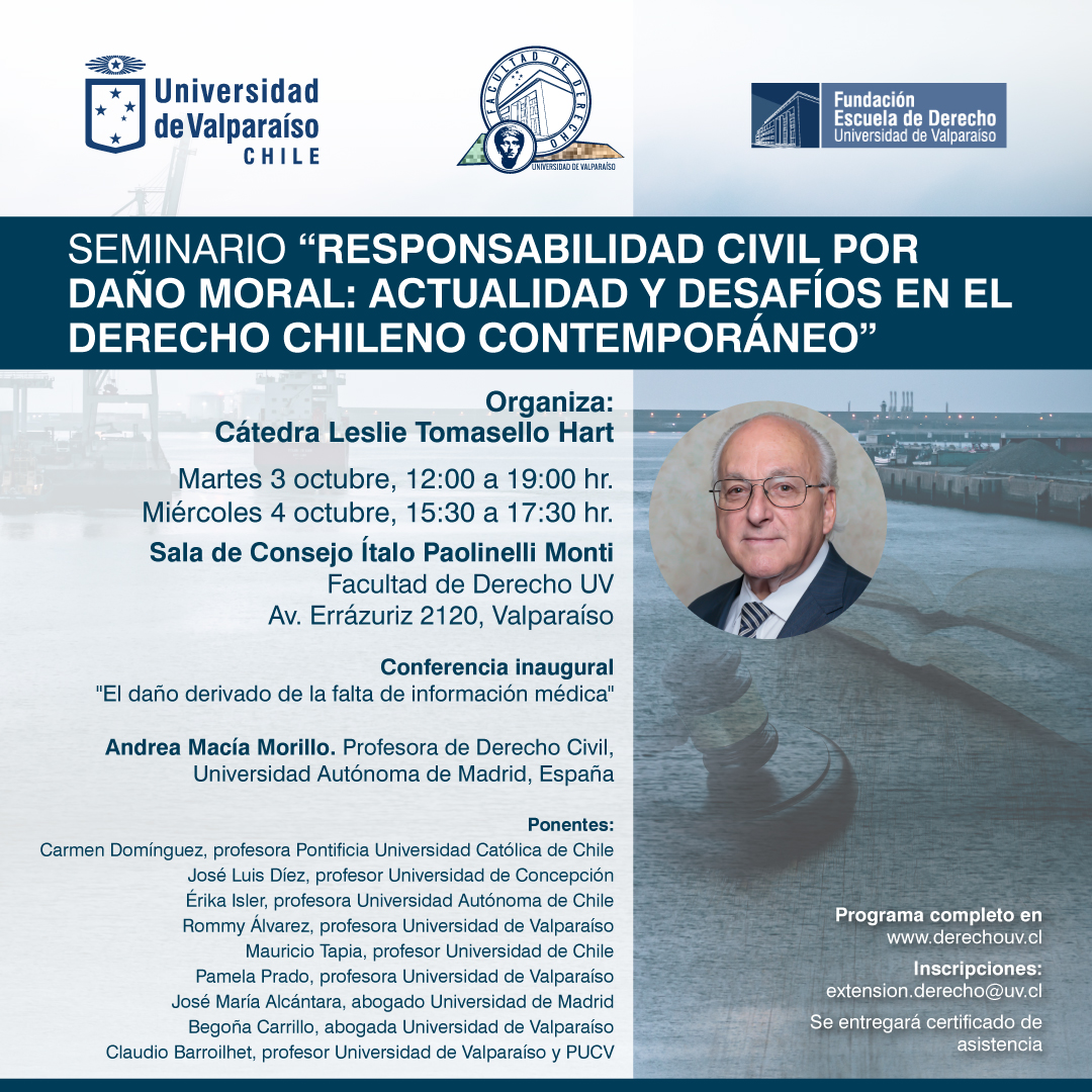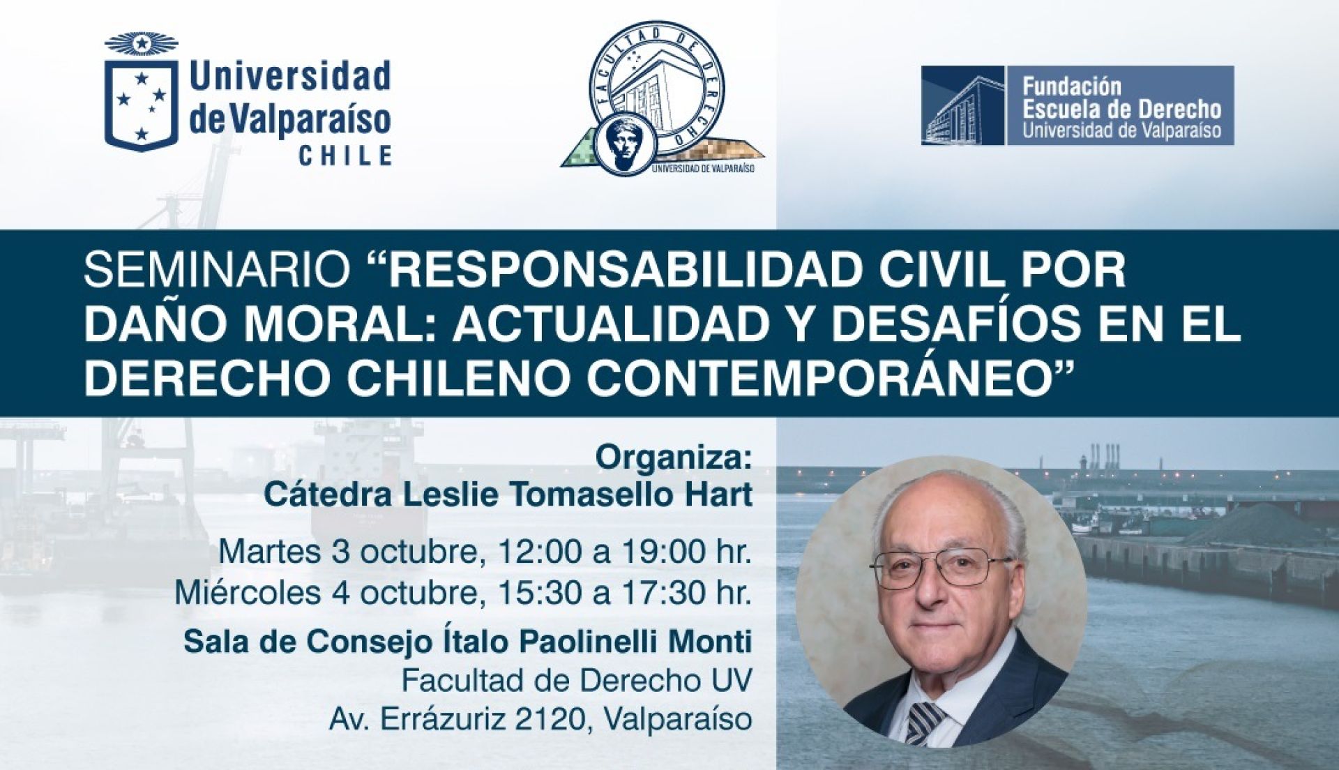 El seminario “Responsabilidad civil por daño moral: Actualidad y desafíos en el Derecho chileno contemporáneo” se llevará a cabo el martes 3 y miércoles 4 de octubre, en la Sala de Consejo Ítalo Paolinelli Monti de la Facultad de Derecho de la Universidad de Valparaíso.
