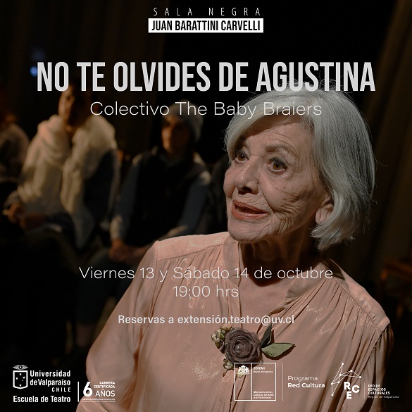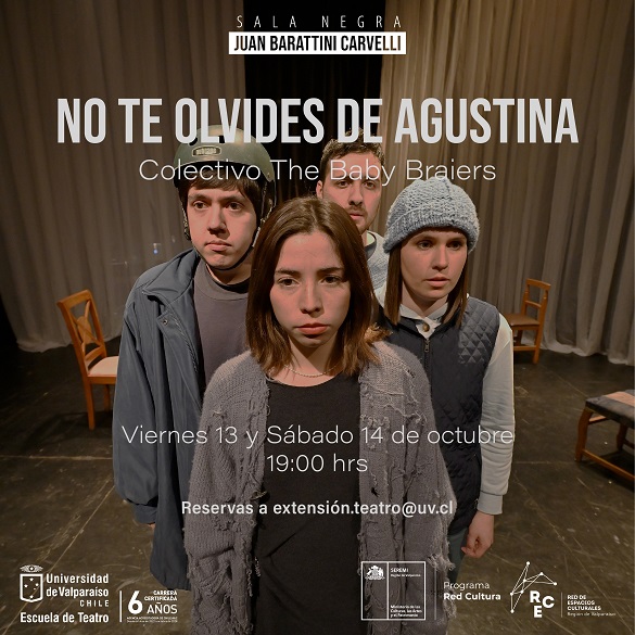 El Colectivo The Baby Braiers se presenta este viernes 13 y sábado 14 de octubre, a las 19:00 horas, en la temporada teatral de la Sala Negra UV, ubicada en avenida Brasil 1647, Valparaíso, con la obra “No te olvides de Agustina”, escrita y dirigida por Heidrun María Breier e interpretada por Isidora Urra, Lucas Guglielmucci, América Navarro, Alejandro Avendaño y Naldy Hernández.