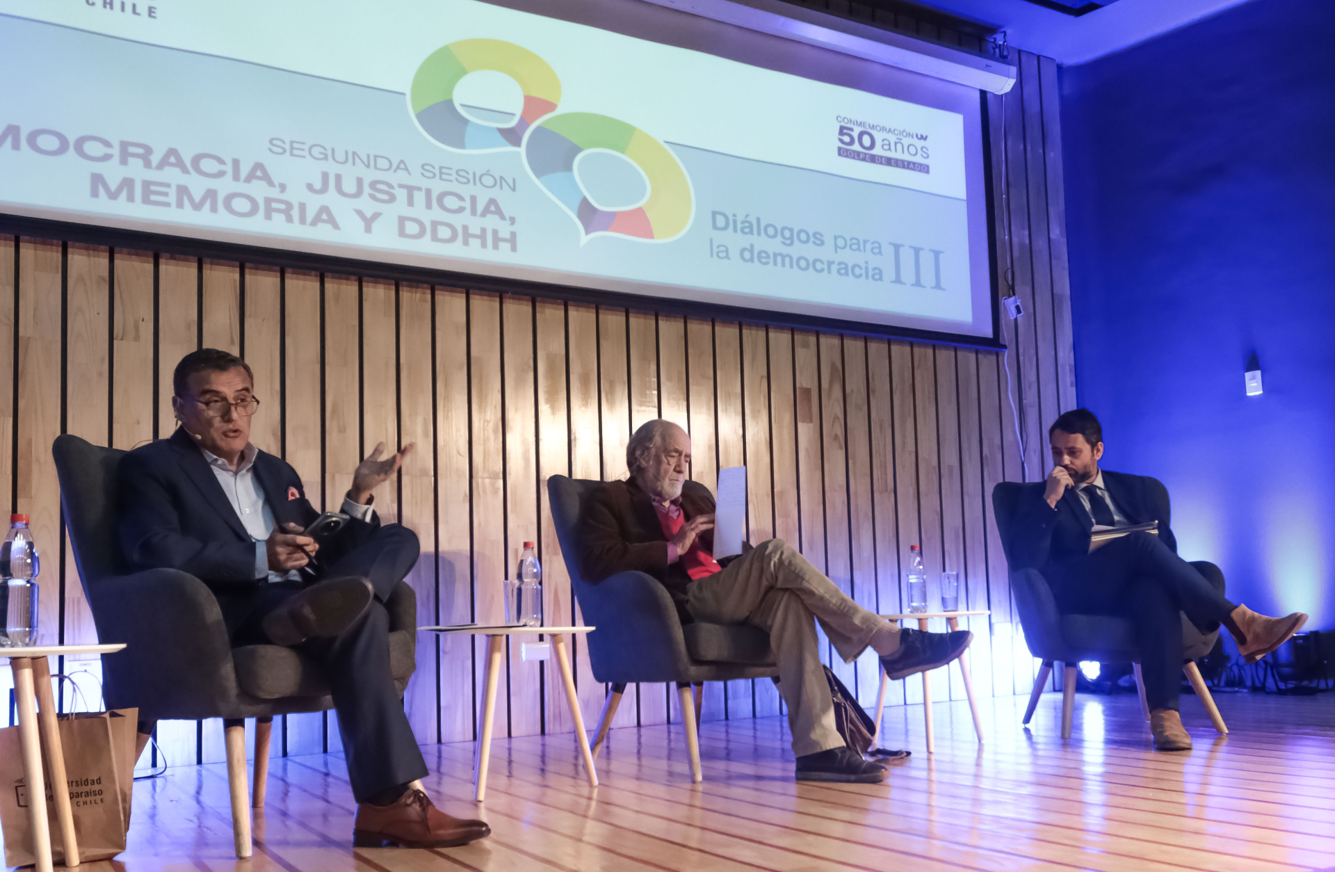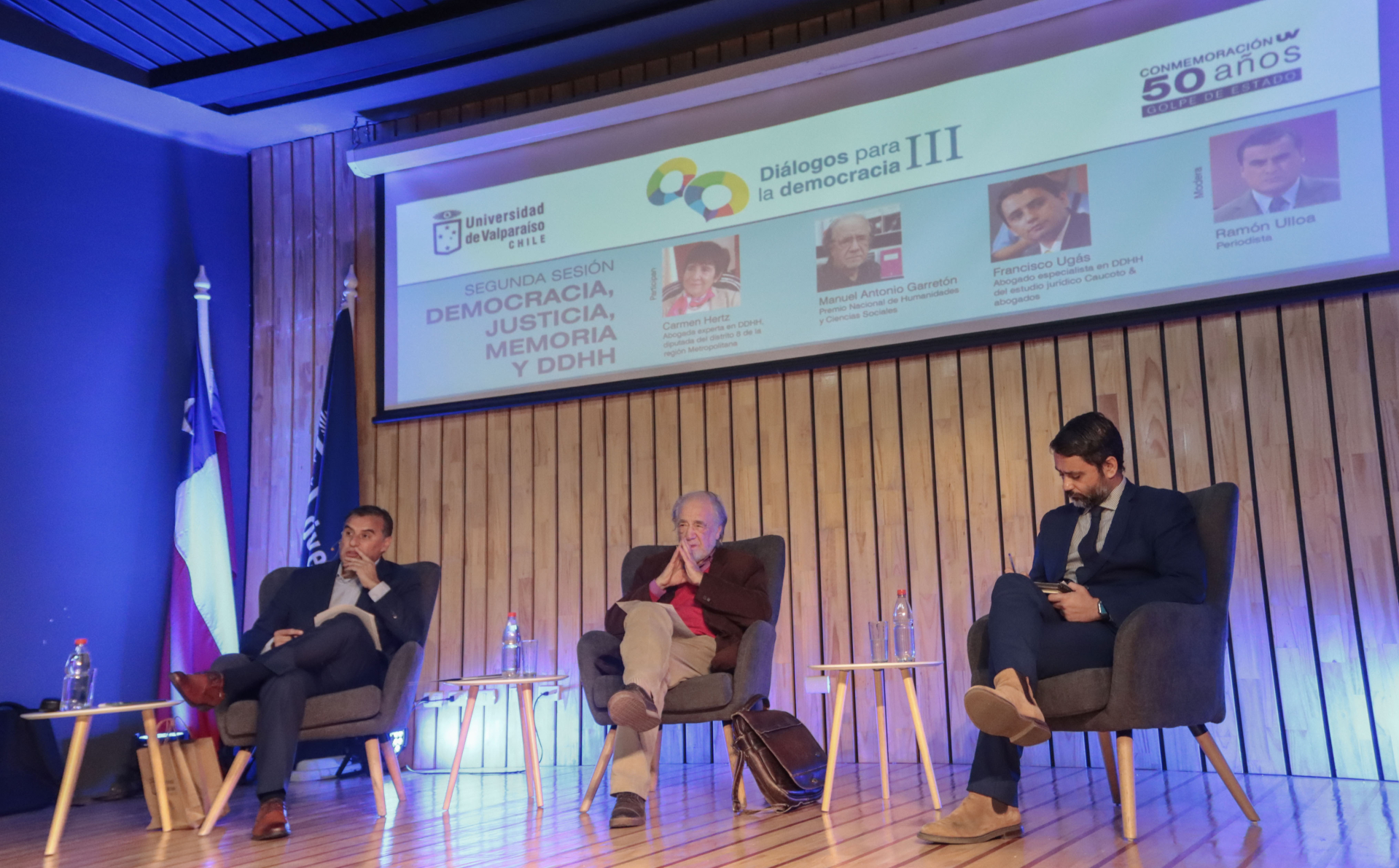 “Justicia, memoria y Derechos Humanos” fue el tema analizado en la segunda sesión del ciclo Diálogos para la Democracia, que en su tercera versión está desarrollando la Universidad de Valparaíso. Los participantes de esta mesa, que tuvo lugar este viernes 13 en la Facultad de Ciencias Sociales de la casa de estudios, fueron el sociólogo y politólogo Manuel Antonio Garretón, Premio Nacional de Humanidades y Ciencias Sociales, y el abogado Francisco Ugás, especialista en Derechos Humanos del estudio jurídico Caucoto & Abogados. Por razones de salud, estuvo ausente la diputada Carmen Hertz.