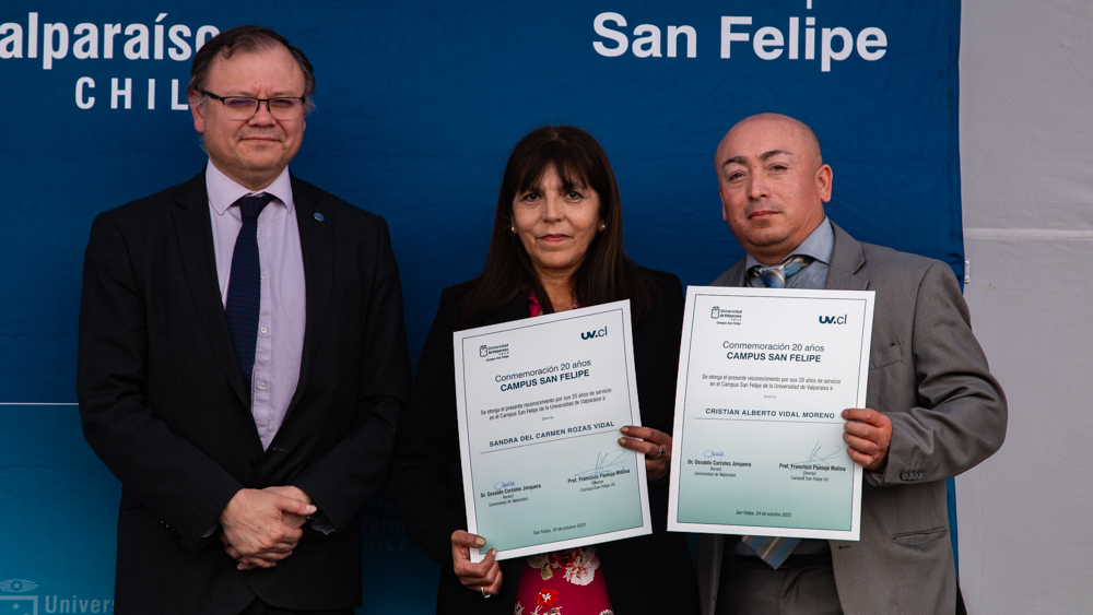 En la oportunidad, fueron distinguidos por cumplir veinte años de trayectoria en el Campus, Sandra Rozas, Cristián Vidal y José Luis Bucarey. Por quince años, Víctor Castro, Cynthia Yáñez, Elizabeth Jaramillo, Leticia Lepe y Verónica Najarí. Y por diez años de trayectoria, Pamela Pizarro, Lorena Currilem, Guillermo Espinoza y Elizabeth Moya.