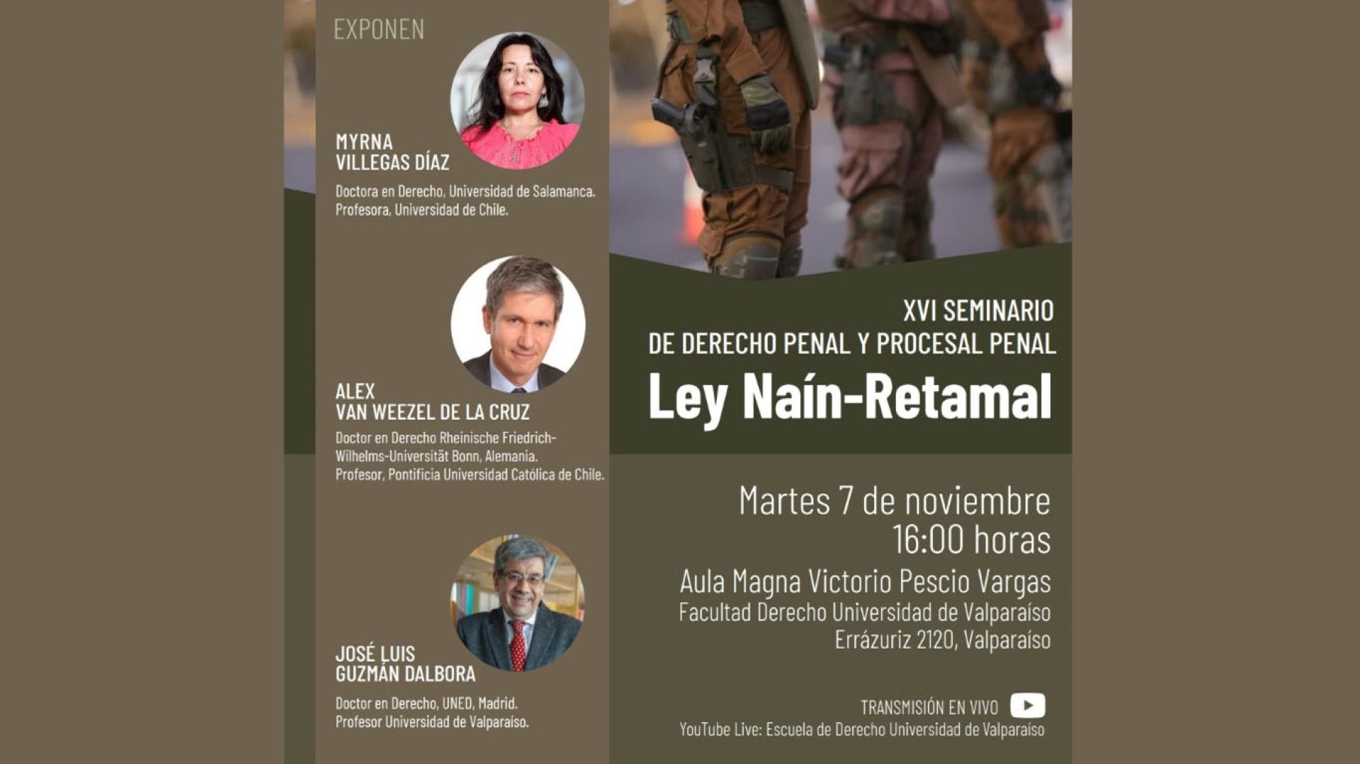 Bajo el título “Ley Naín-Retamal con énfasis en la legítima defensa” se desarrollará este martes 7 de noviembre el XVI Seminario de Derecho Penal y Procesal, actividad académica que anualmente organizan la Facultad de Derecho de la Universidad de Valparaíso y la Defensoría Regional de Valparaíso.