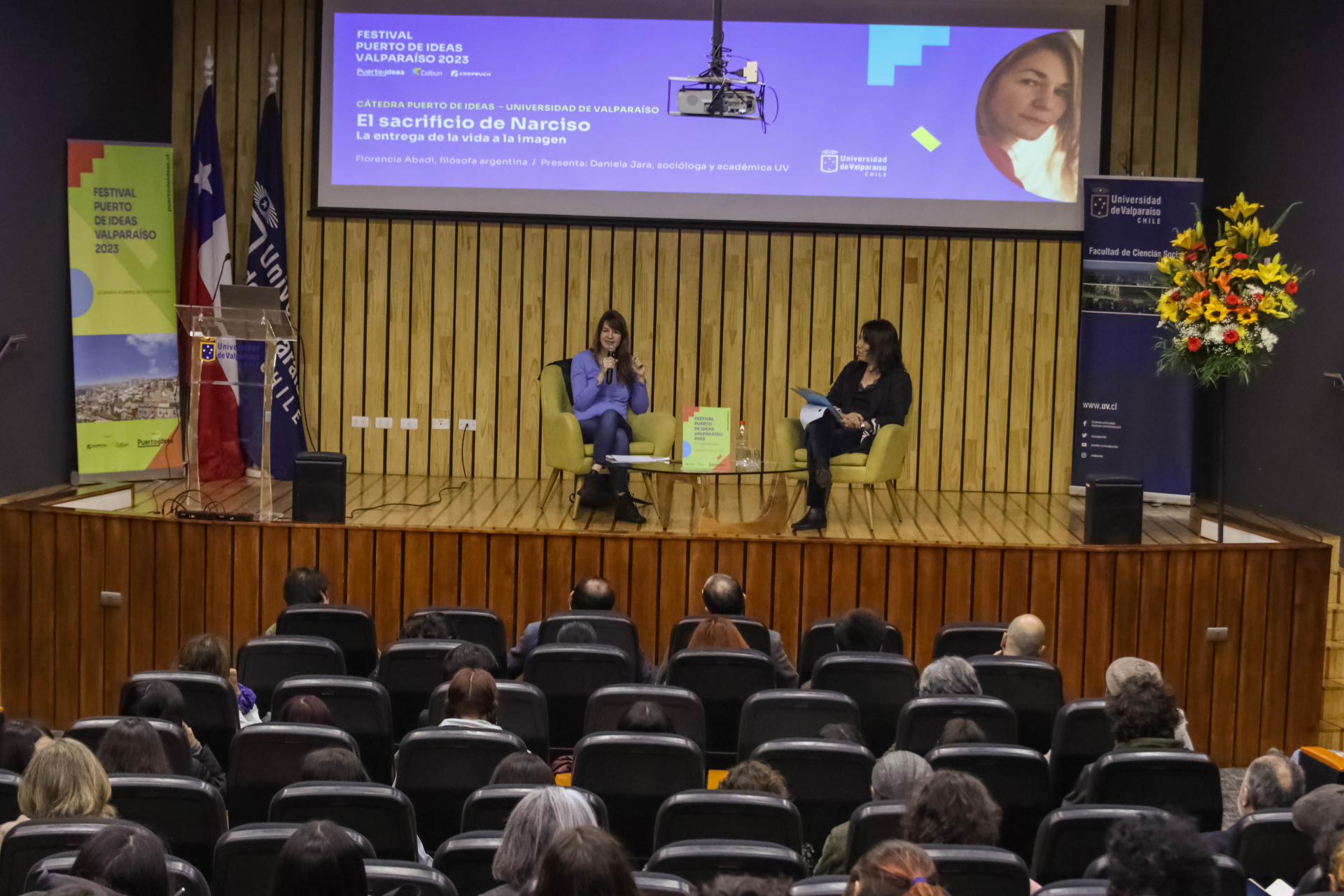 En la oportunidad, en una actividad con entrada liberada para todo público, la cátedra fue dictada por la filósofa argentina Florencia Abadi, quien desarrolló el tema “El sacrificio de Narciso. La entrega de la vida a la imagen”. La académica trasandina fue presentada por Daniela Jara, directora de la Escuela de Sociología Facso UV.