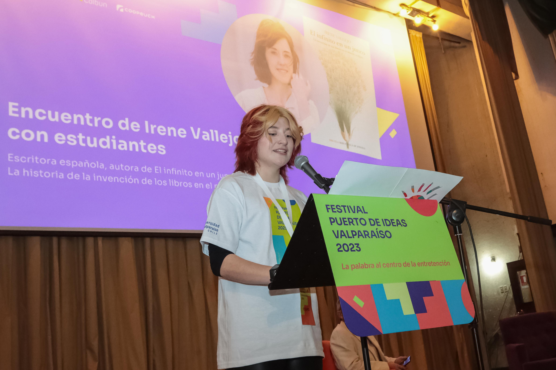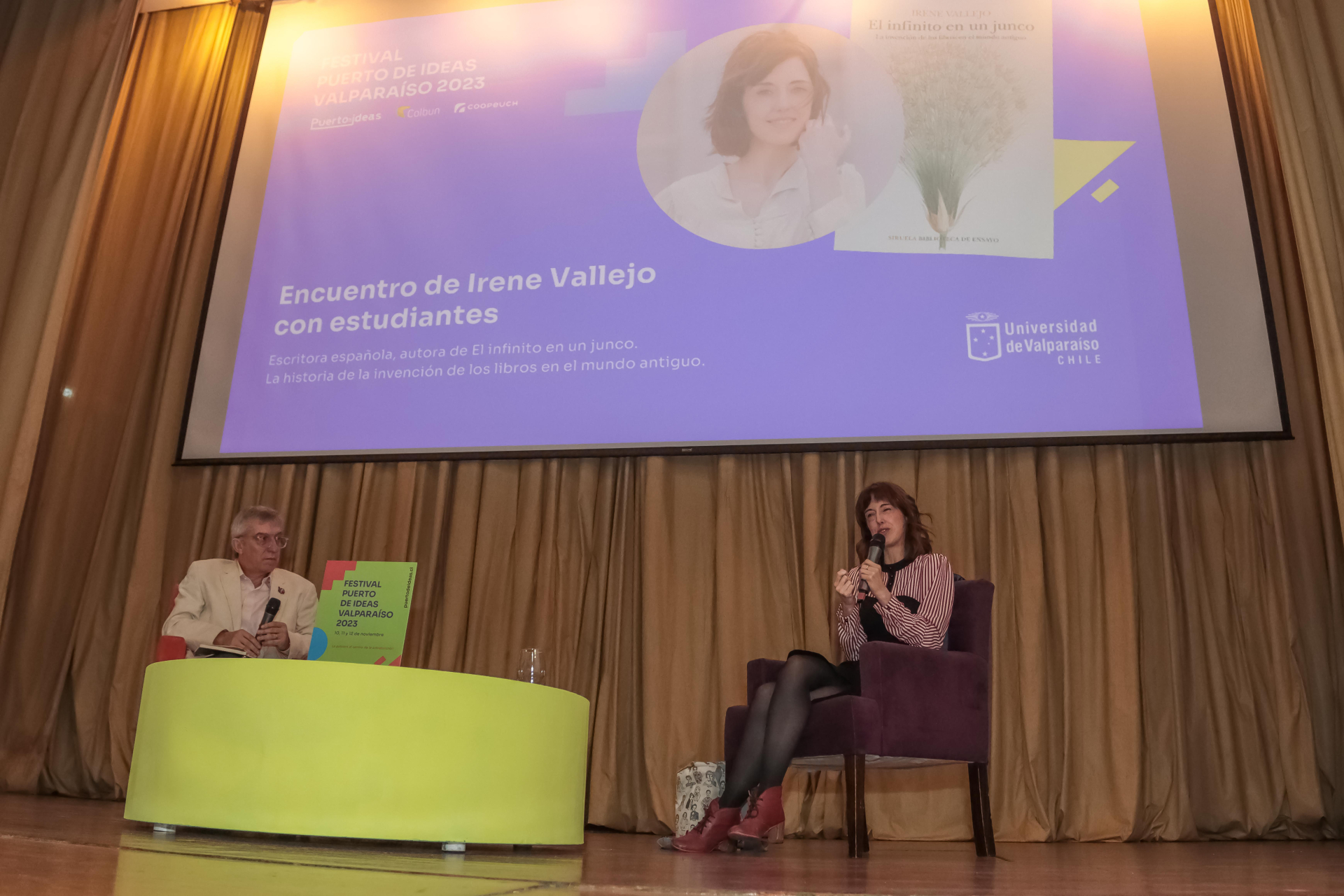 Por su parte, David López, coordinador de gestión de Proyectos Culturales de la Dirección de Extensión y Comunicaciones de la UV, relevó: “Puerto de Ideas es un festival que dura tres días, con una parrilla programática para todo el mundo, pero desde hace un par de años está desarrollando actividades específicas para escolares de la región. Tuvimos un Aula Magna completa, para que las y los jóvenes pudieran compartir con una escritora como Irene Vallejo y conocieran todo el trabajo que ella realiza”.