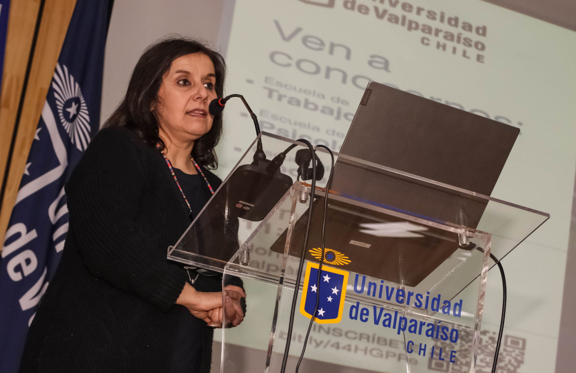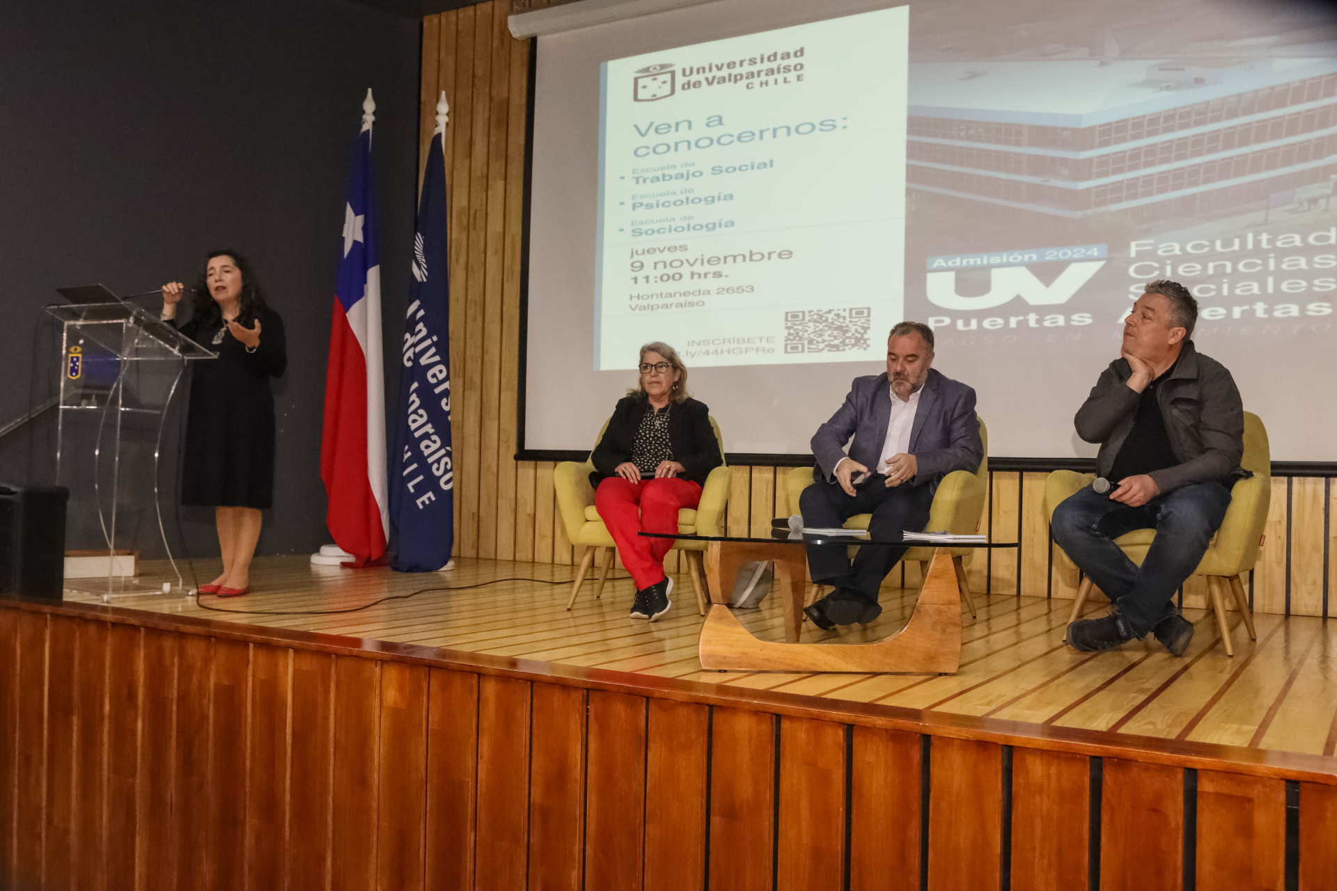 La actividad se inició a las 11:00 con un saludo de la secretaria de Facultad, María Angélica Cruz, quien representó al decano Juan Sandoval. Luego, hicieron uso de la palabra Elizabeth Vargas, representante del director de la Escuela de Trabajo Social; Gonzalo Lira, director de la Escuela de Psicología, y Marcos Rodríguez, jefe de carrera de Sociología. Cada uno de ellos dio la bienvenida a las y los presentes, para luego entregar una breve reseña de sus carreras.