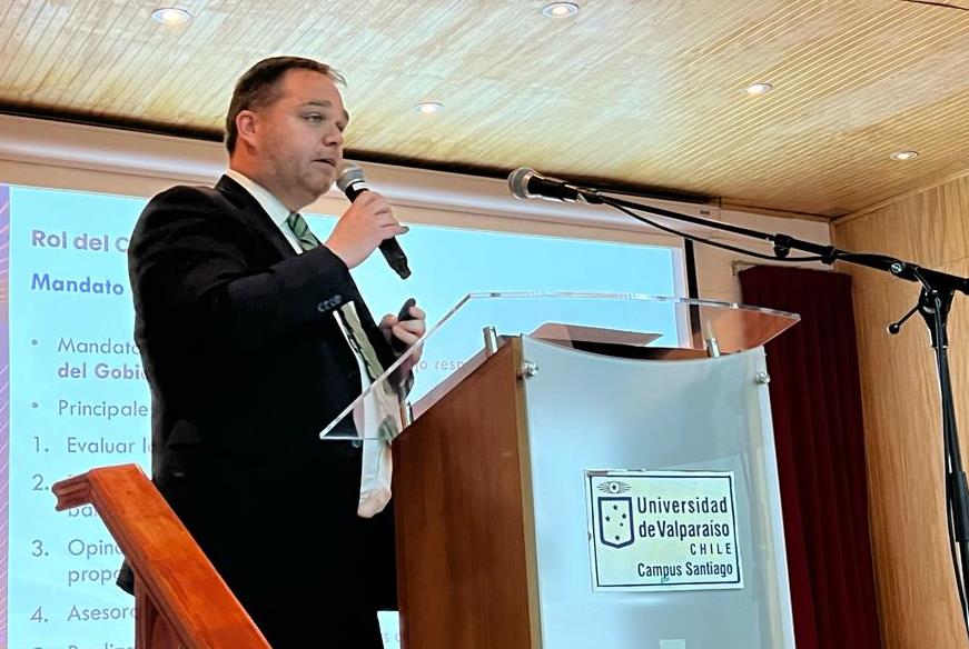 El gerente de Estudios del Consejo Fiscal Autónomo, Mario Arend Serrano, explicó las funciones de este organismo —cuyo objetivo es contribuir al manejo responsable de la política fiscal del Gobierno central— y analizó la situación actual y perspectivas, en la conferencia “Rol del Consejo Fiscal Autónomo (CFA) y desafíos de sostenibilidad fiscal”, que se realizó en el teatro del Campus Santiago de la Universidad de Valparaíso.