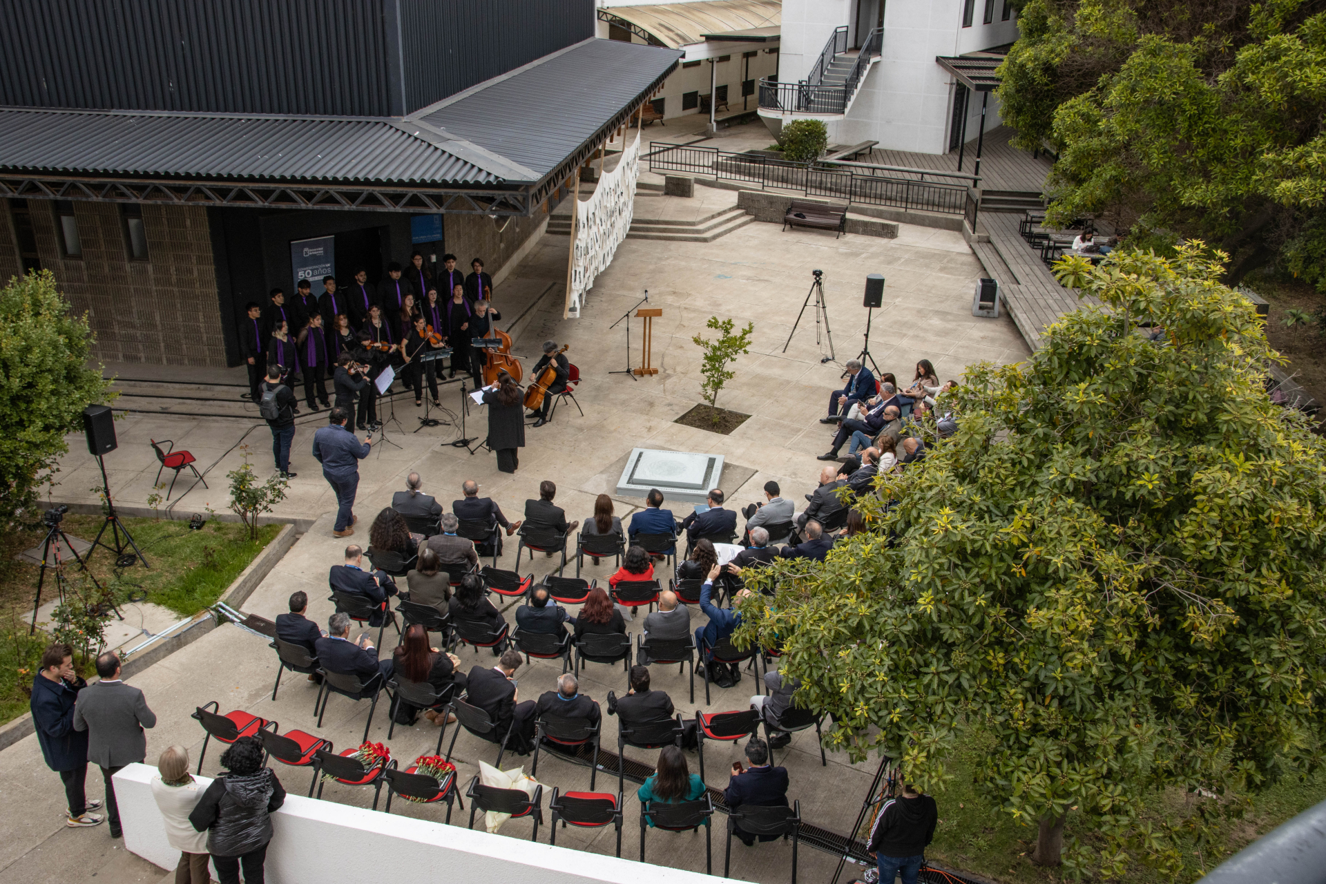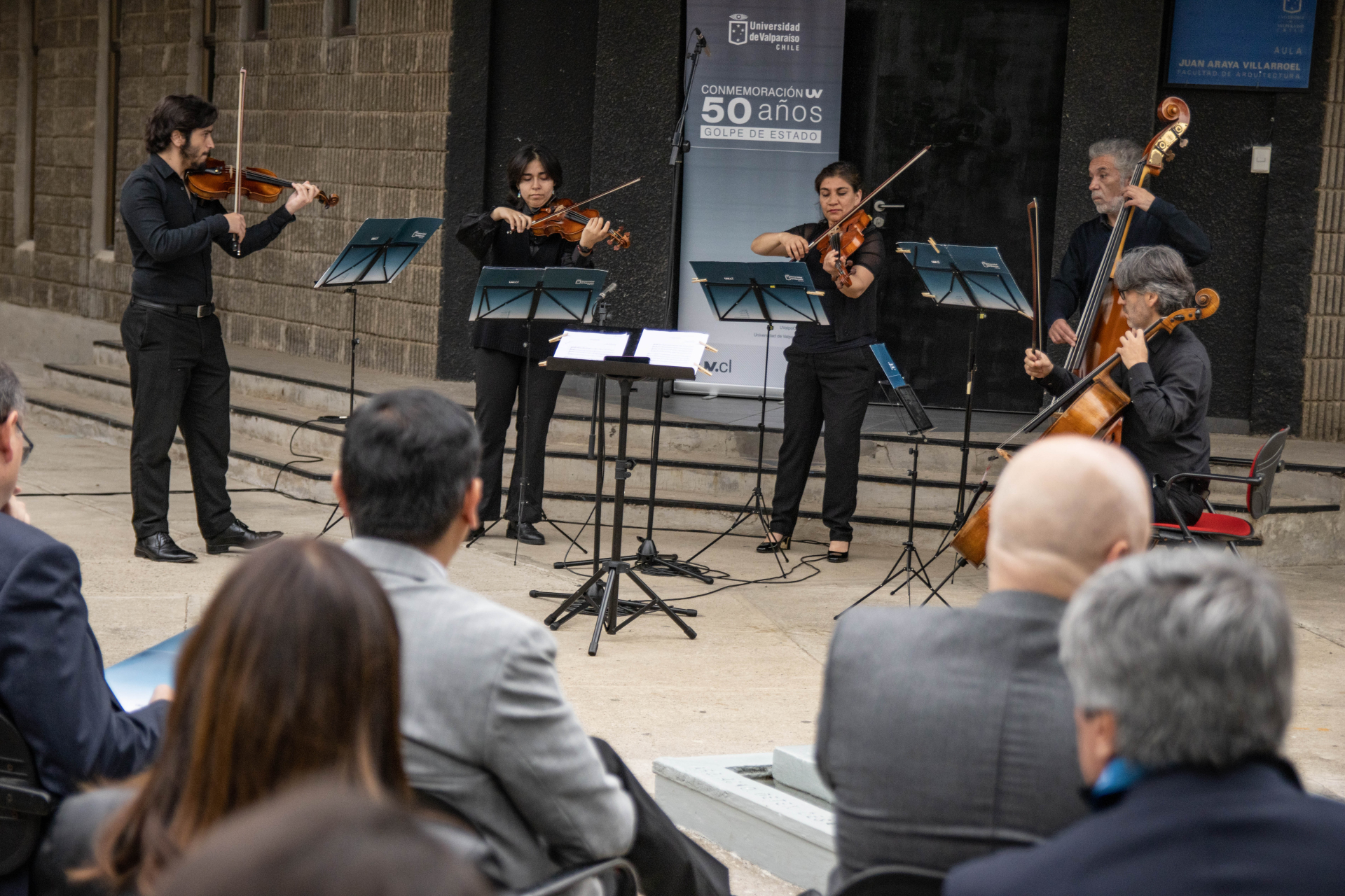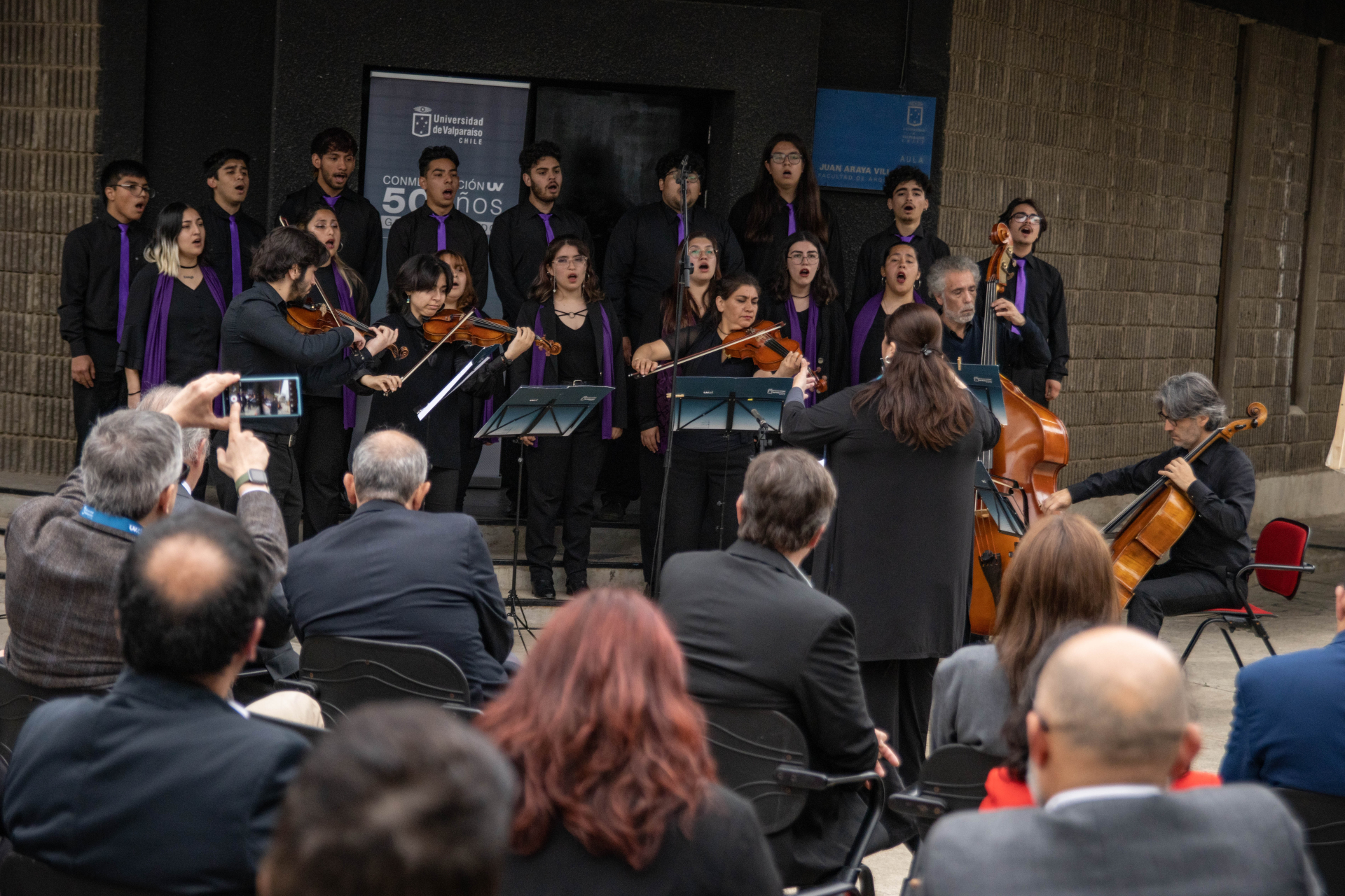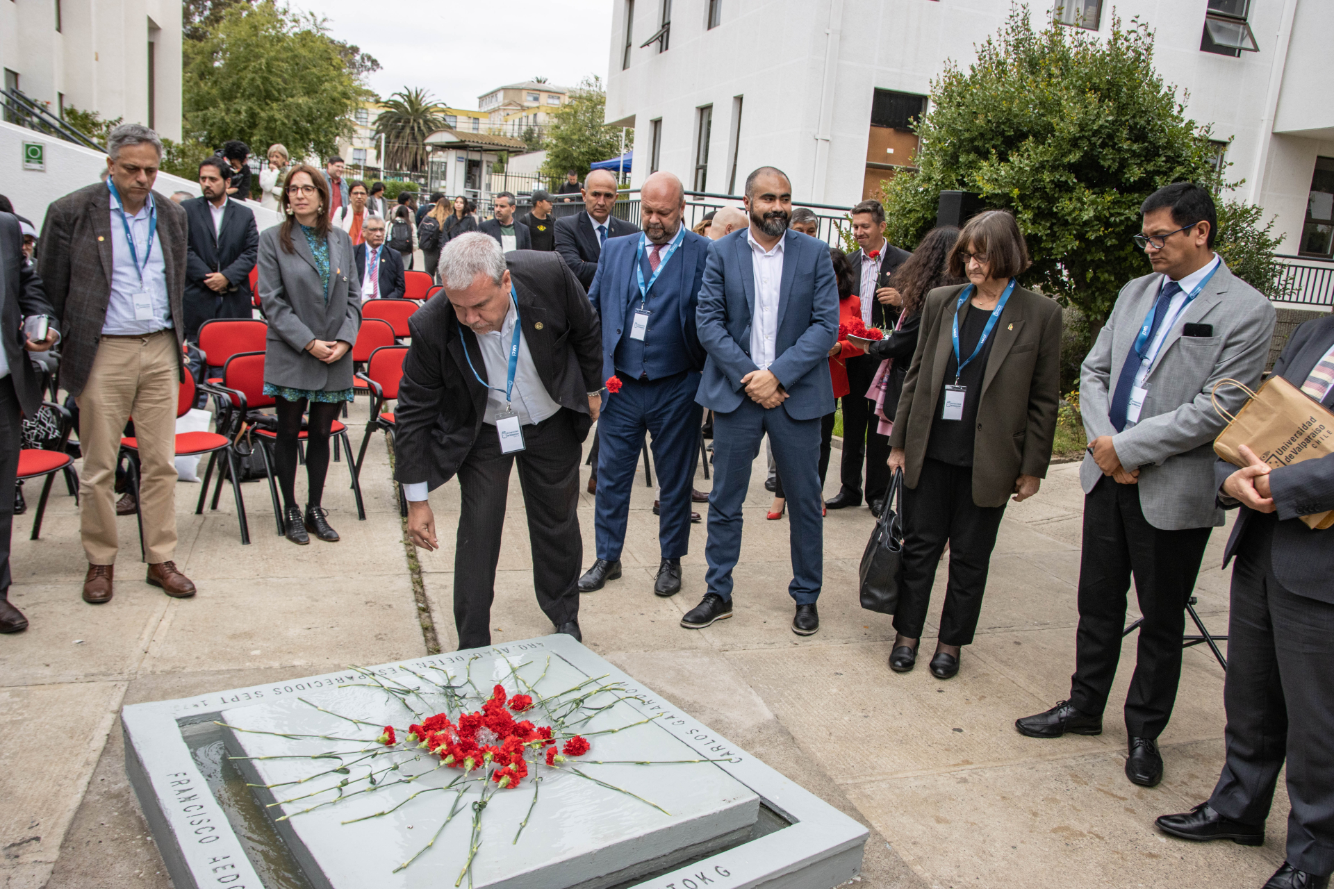 Luego, los rectores se dirigieron a la Facultad de Arquitectura en el Campus UV de Playa Ancha, donde se realizó una actividad conmemorativa en homenaje al destacado cantautor nacional Víctor Jara. Durante esta ocasión, se llevó a cabo una ofrenda en el Cenotafio en memoria de los Detenidos Desaparecidos de la Escuela de Arquitectura.
