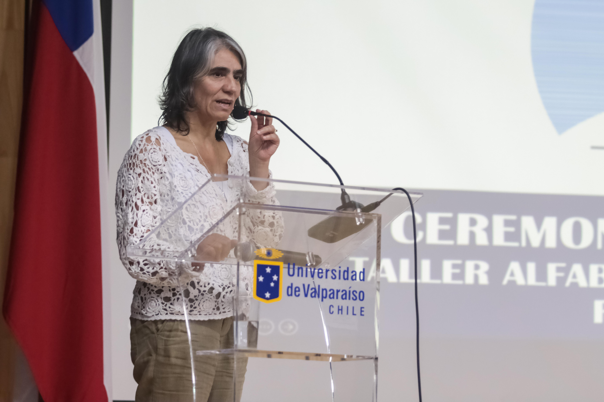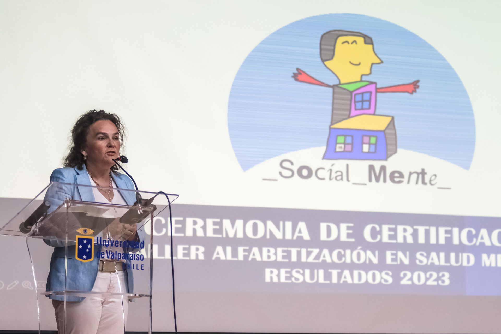 La entrega de los certificados respectivos a quienes se graduaron del programa de alfabetización en salud mental de la UV se concretó durante una ceremonia que tuvo lugar en el auditorio de la sede Hontaneda, la cual fue presidida por la directora de la Escuela de Medicina, Catherine Soto.
