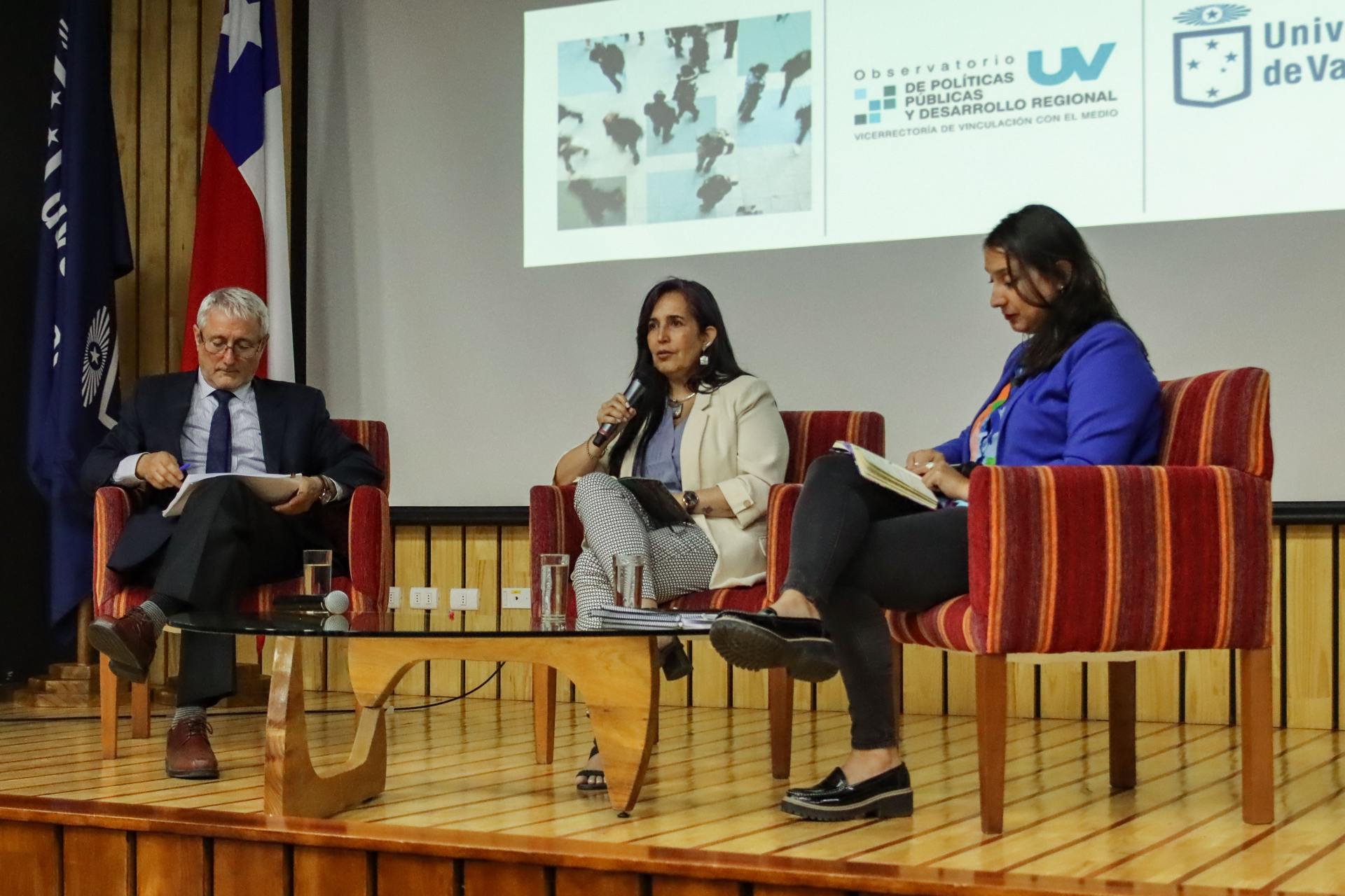 La presentación del trabajo realizado por el Observatorio de Políticas Públicas de la UV concluyó con un panel de conversación en el que el profesor Aldo Valle dialogó con las secretarias regionales ministeriales de Educación y de Desarrollo Regional y Familia, Romina Maragaño y Claudia Espinoza, respectivamente, sobre los alcances de los estudios presentados.