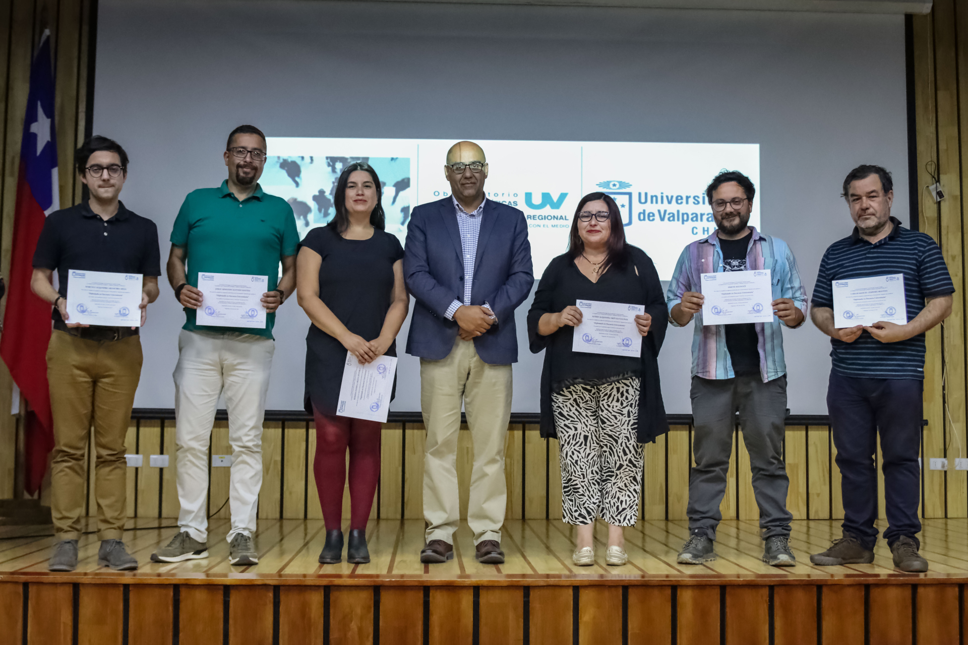El acto contó con la presencia del decano de la Facultad de Ciencias Sociales, Gonzalo Lira; la directora general de Pregrado, Virginia Sánchez; el director de la Escuela de Psicología, Carlos Varas; la coordinadora del Diplomado, Francisca Bernal, y la coordinadora de la Unidad de Gestión Curricular y Desarrollo Docente, Claudia Schiattino.