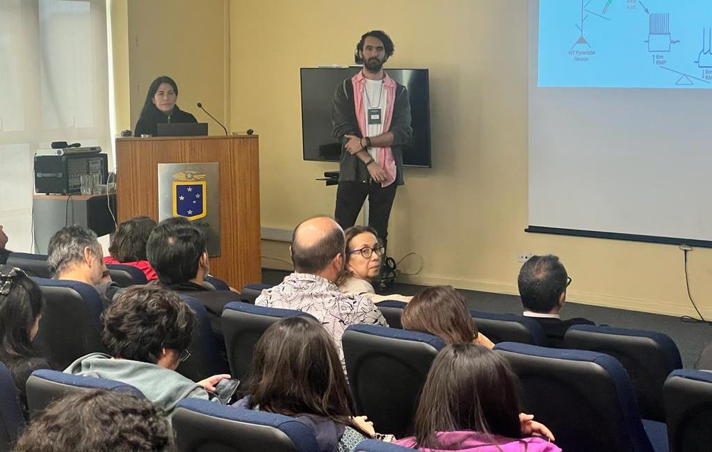 Durante la jornada, las y los estudiantes tuvieron un rol destacado en las presentaciones. Es el caso de Maylin Wong Guerra, de la Usach, quien estuvo a cargo de la conferencia "Shilajit Andino: un nuevo agente antiinflamatorio, antiagregante de la proteína tau y neuritogénico para el tratamiento de la Enfermedad de Alzheimer"; Agustín Robles, de la PUC, quien presentó “Protein-Protein interaction as a potential therapeutic opportunity”, y Sol Retamales, de la UV, a cargo de la charla "Efectos multigeneracionales de la diapausa inducida por altas temperaturas en C. elegans". En la segunda ronda de exposiciones participaron Claudio Moreno, de la Usach, con la conferencia "Rol de Ih y Kir en la plasticidad homeostática de neuronas piramidales de la corteza auditiva de animales modelo de Síndrome de X frágil", y Jonathan Saavedra, de la UV, quien expuso “SNX-482α una variante de la toxina SNX482 específica y exclusiva para el canal de calcio Cav2.3 como agente neuroprotector en el tratamiento de la enfermedad del Parkinson”. Se sumó el director Eugenio Rodríguez, a cargo de la charla “Neurociencia y Educación, dilemas y desafíos del puente en construcción”.