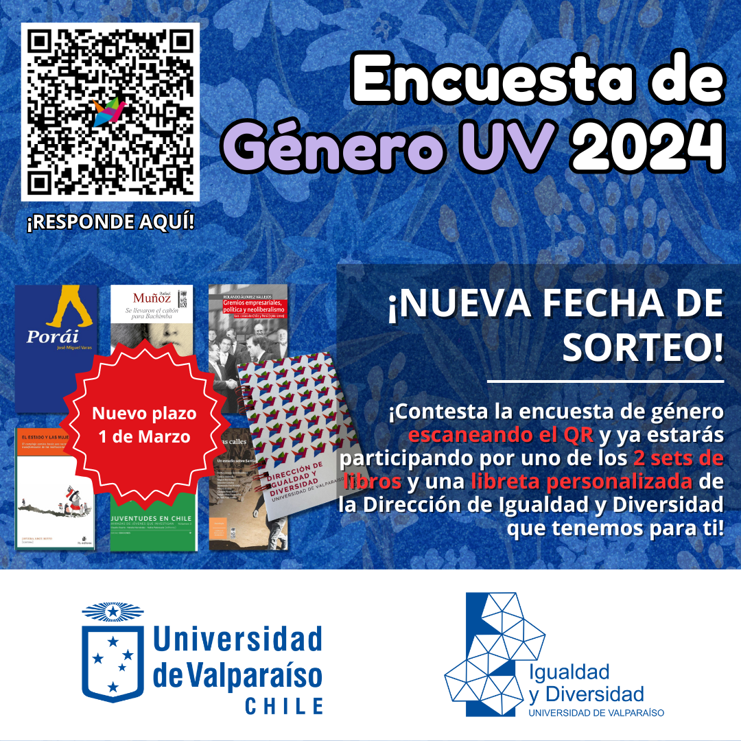 A fin de establecer la situación de las relaciones de género en la Universidad de Valparaíso, la Dirección de Igualdad y Diversidad (DID) está desarrollando la Encuesta de Género UV 2024. Para incentivar la participación, se sortearán dos sets de libros y una libreta personalizada entre quienes respondan el cuestionario. Este sorteo, que se había anunciado para el jueves 25 de enero, se realizará el viernes 1 de marzo.
