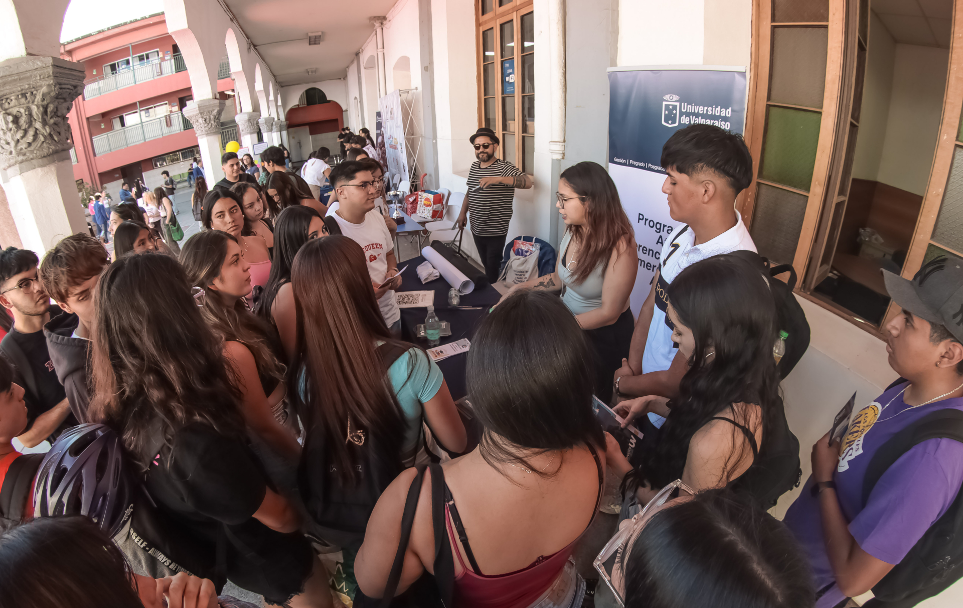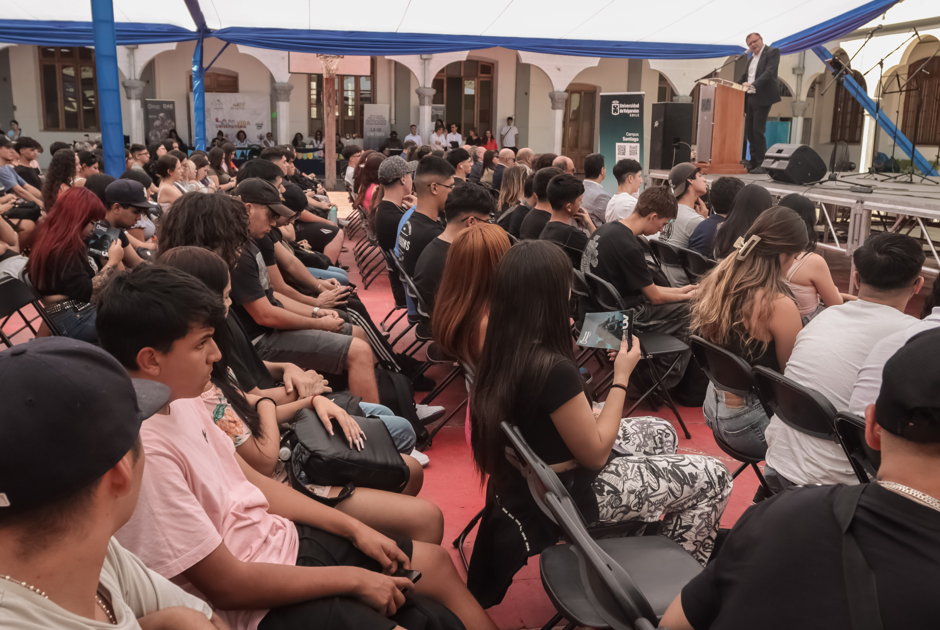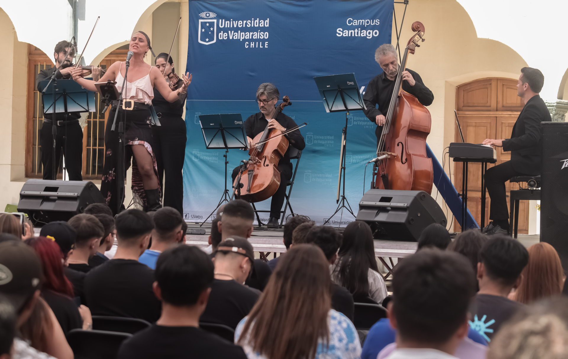 El evento de bienvenida se llevó a cabo en el patio central del recinto capitalino y consideró un saludo inicial del director subrogante del Campus Santiago, Jaime Vera, y la actuación musical de la Agrupación Musical de Cámara de la Universidad de Valparaíso junto a la cantante Daniela Aleuy.