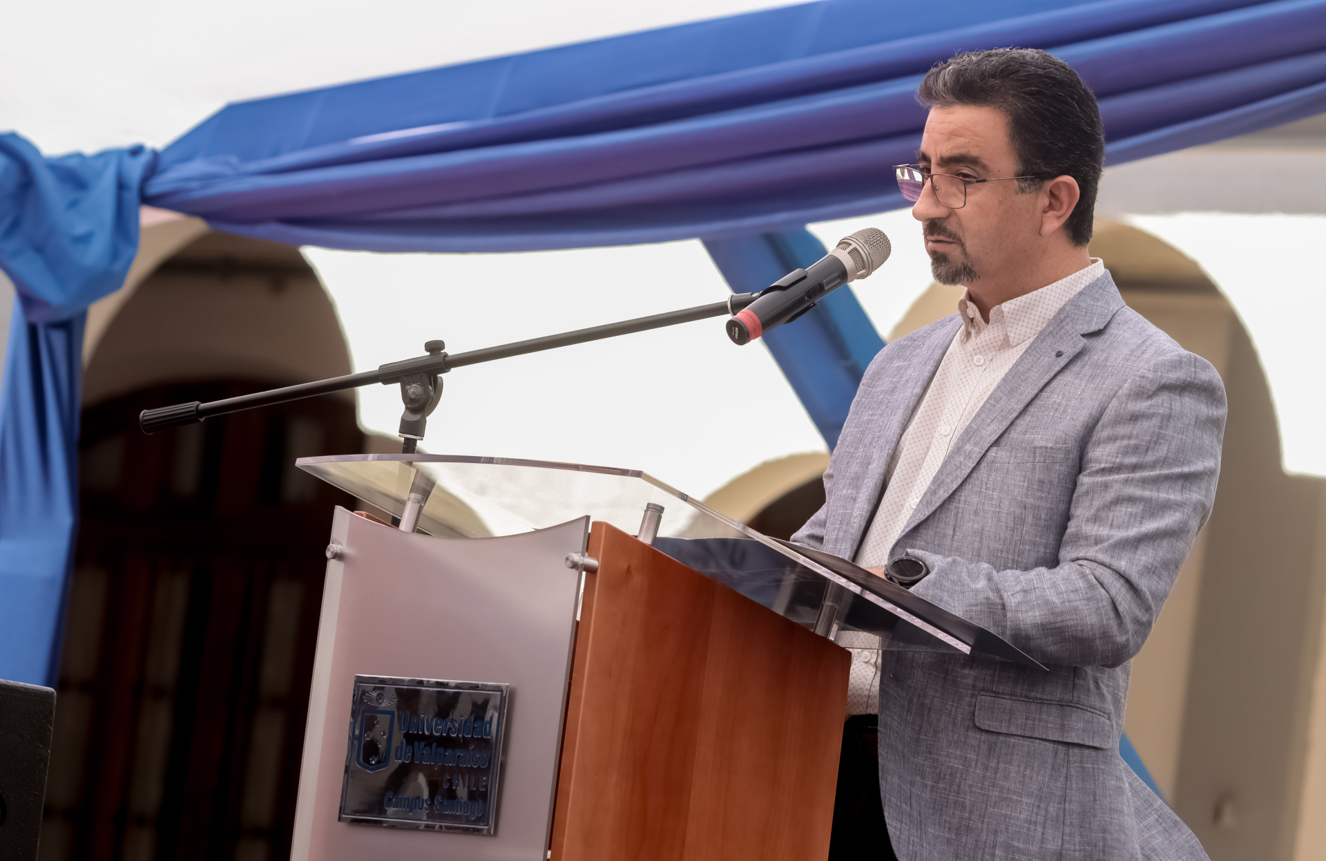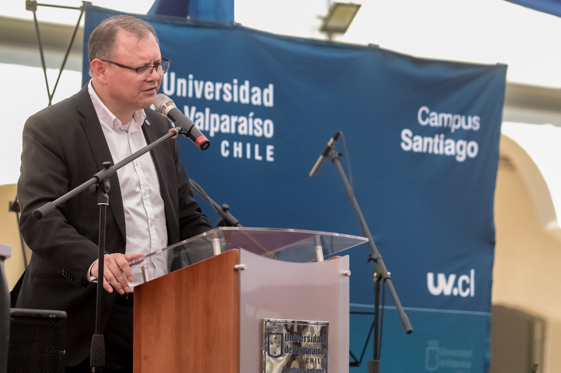 El director subrogante del Campus Santiago, Jaime Vera, fue el encargado de dar un breve saludo inicial, en el cual expresó que “es motivo de alegría recibir a una nueva generación de estudiantes que han confiado en nuestra institución para formarse como profesionales y personas”. Además, sostuvo que la UV “ha generado impactos positivos en su entorno desde que está presente en San Miguel, lo que es consistente con la misión de una universidad pública”.