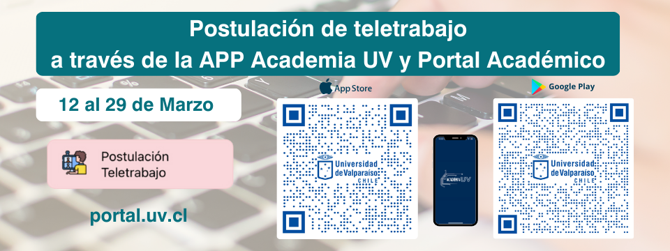 El formulario electrónico estará disponible en el portal institucional, https://portal.uv.cl, en el link “módulo Postulación Teletrabajo”. Otra alternativa para efectuar la postulación es a través de la APP Academia. En caso de no poder acceder a alguna de estas plataformas o no disponer de la clave, los funcionarios y funcionarias deben escribir a