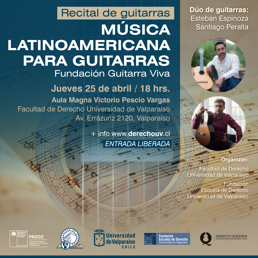 La Facultad de Derecho de la Universidad de Valparaíso ofrecerá a la comunidad el recital “Música latinoamericana para guitarras”, ocasión en que se presentará el dúo compuesto por Esteban Espinoza y Santiago Peralta, de la Fundación Guitarra Viva “Ernesto Quezada”.