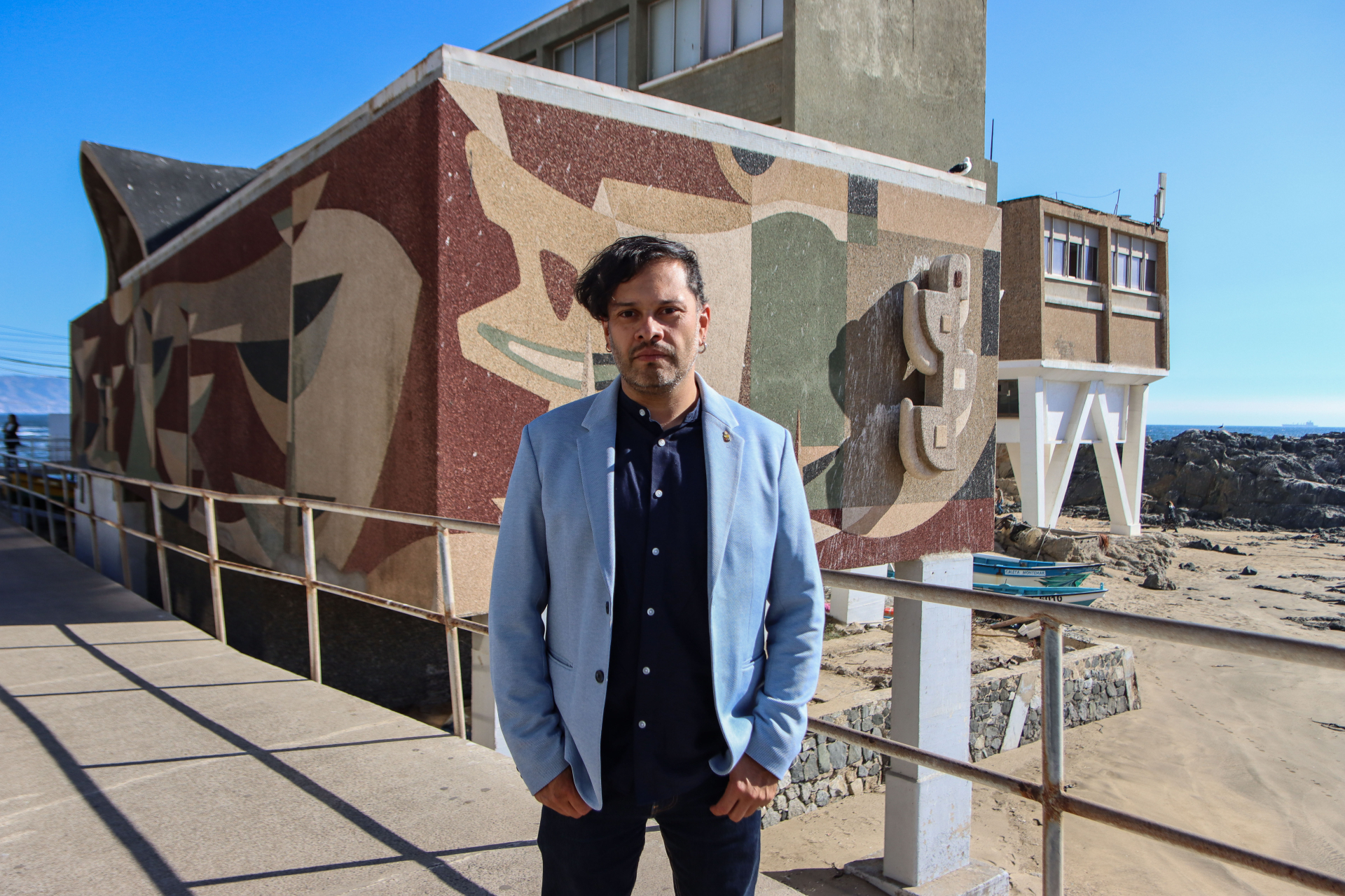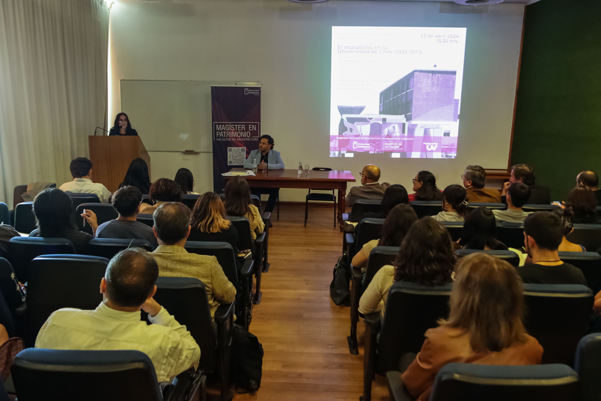 El profesor Vera fue invitado a dictar la conferencia “Patrimonio mural de la Universidad de Chile desde el año 1935 al 1973. Alcances contemporáneos de un patrimonio artístico nacional”, con motivo de la inauguración del año académico 2024 del Magíster en Patrimonio de la Facultad de Arquitectura. La actividad tuvo lugar en el auditorio de la Facultad de Ciencias del Mar, en Montemar, edificio que en su exterior contiene el mural referido.