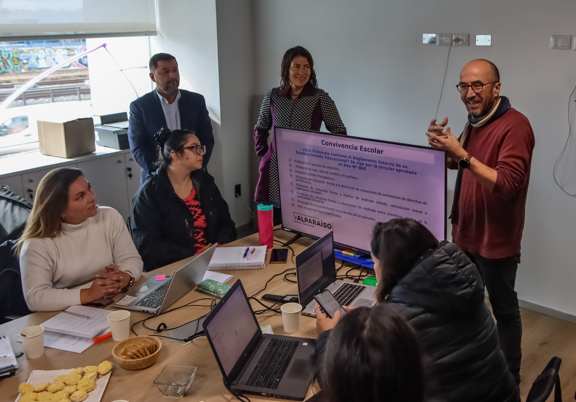 Andrea Calixto, directora del CINV UV y académica de la Universidad de Valparaíso, acompañada de Moisés Acevedo, director ejecutivo, y Jesús Olivares, coordinador de Extensión y Divulgación del mismo centro, se reunieron con los directores y autoridades del Servicio Local de Educación Pública (SLEP) de las comunas de Valparaíso y Juan Fernández, para realizar la entrega de los ejemplares.