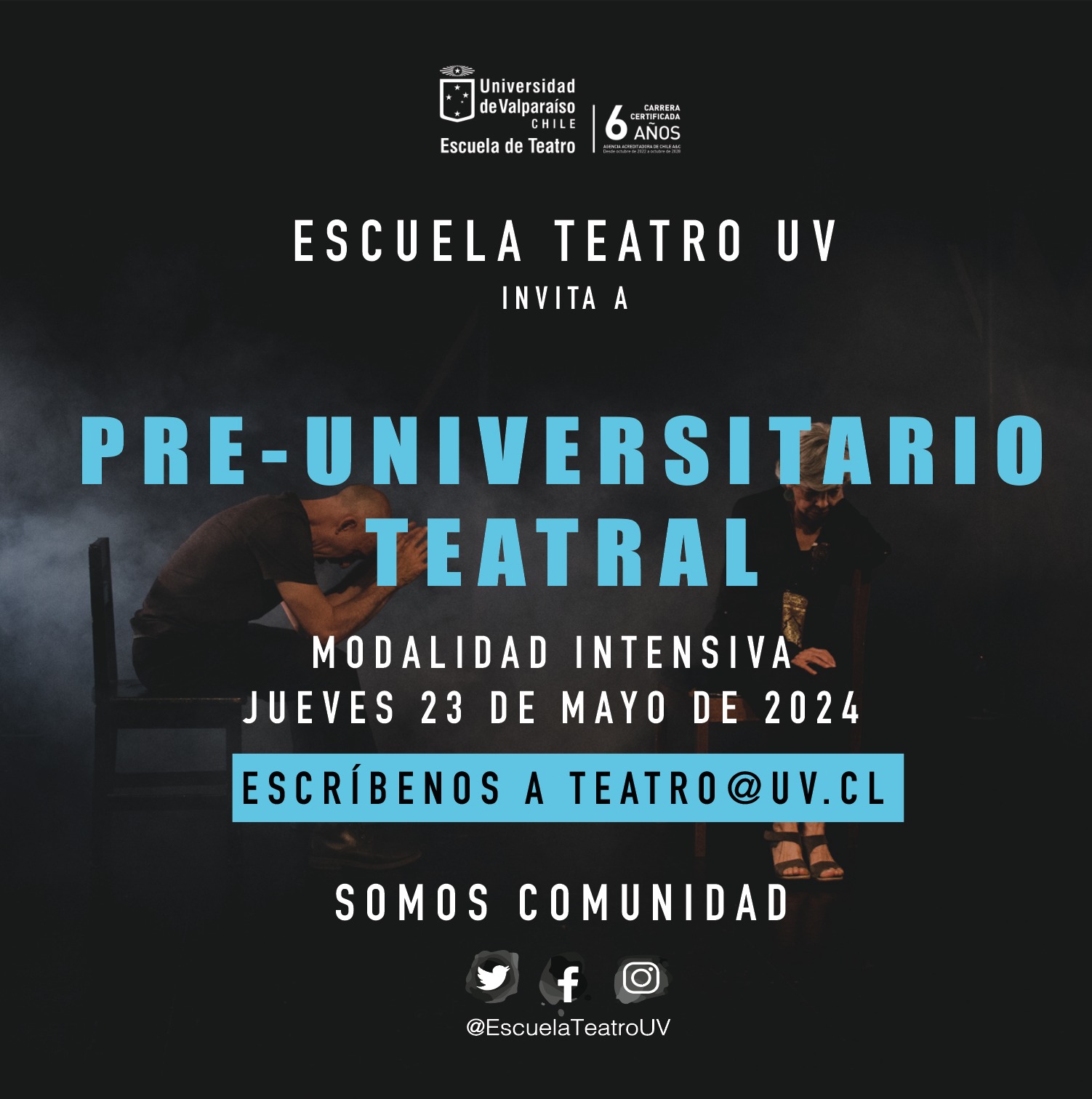 El jueves 23 de mayo, de 15:00 a 18:00 horas, se realizará una nueva versión del tradicional Preuniversitario Teatral gratuito organizado por la Escuela de Teatro UV, ubicada en avenida Brasil 1647, Valparaíso.