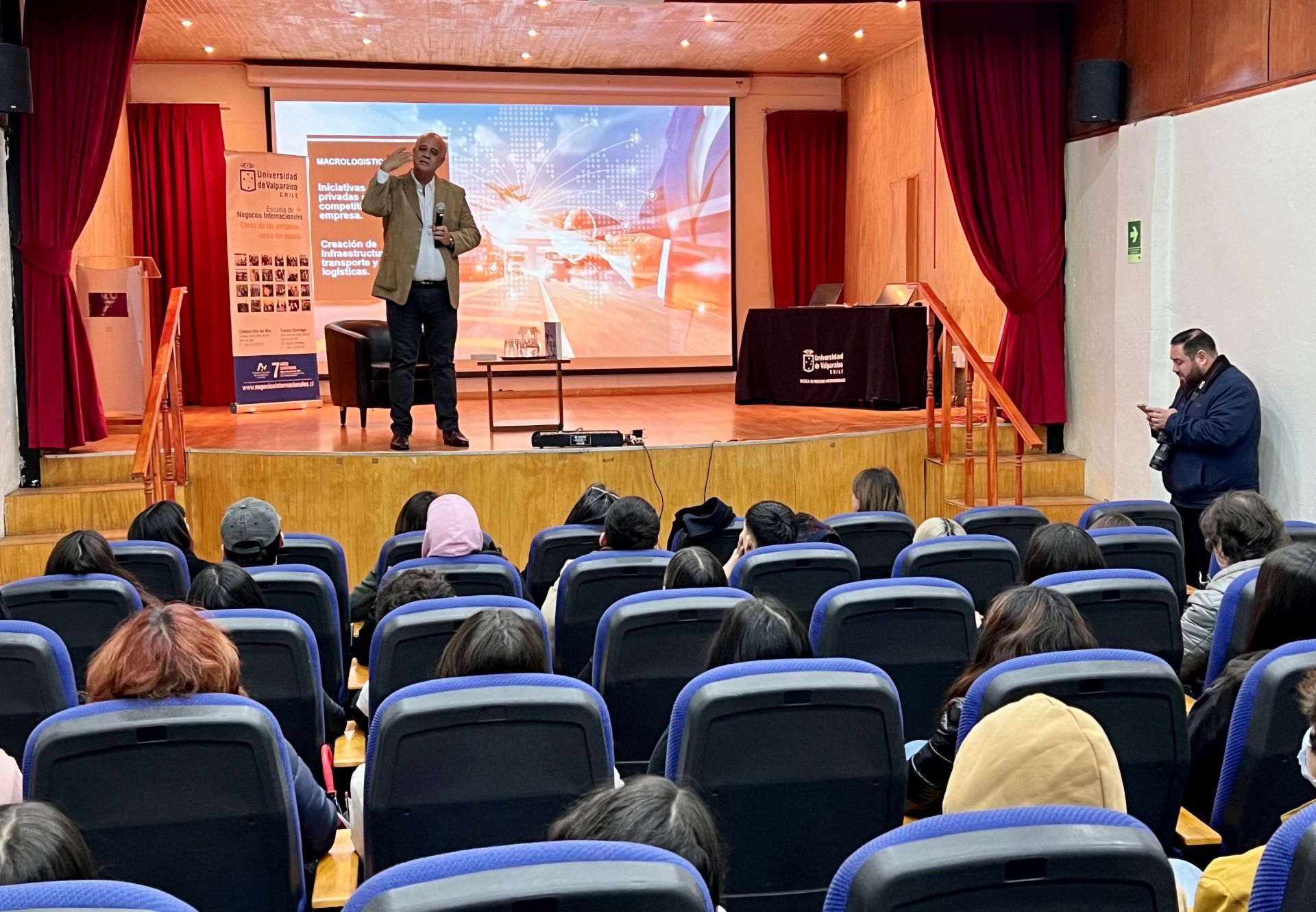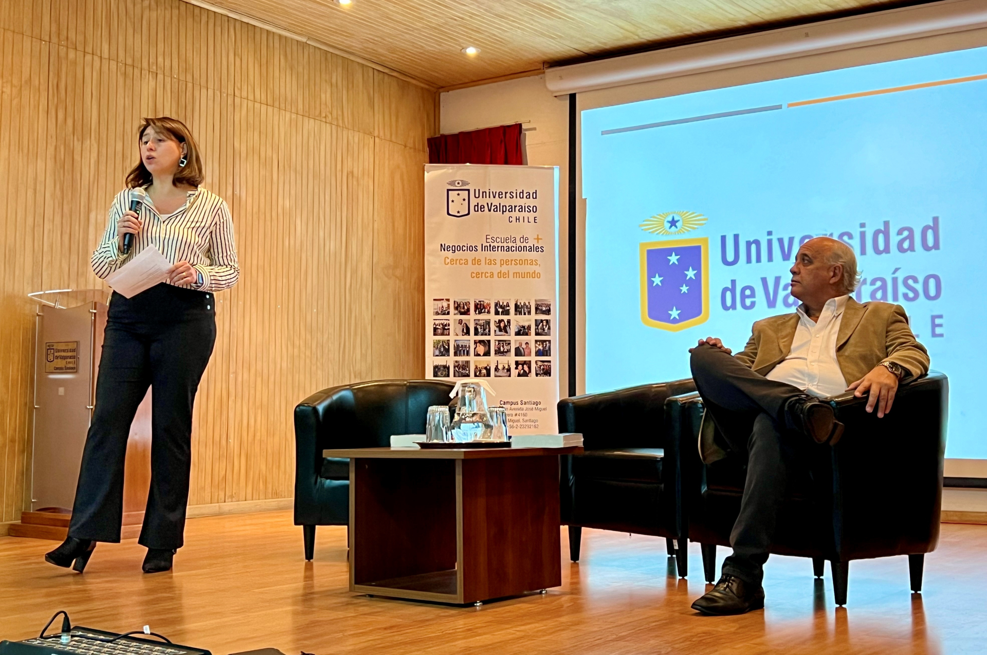 La actividad, que se llevó a cabo este martes 7 de mayo en el teatro del Campus Santiago de la Universidad de Valparaíso, estuvo dirigida principalmente a estudiantes y fue conducida por Daniella De Luca, jefa de carrera de Ingeniería en Negocios Internacionales en el recinto de San Miguel.