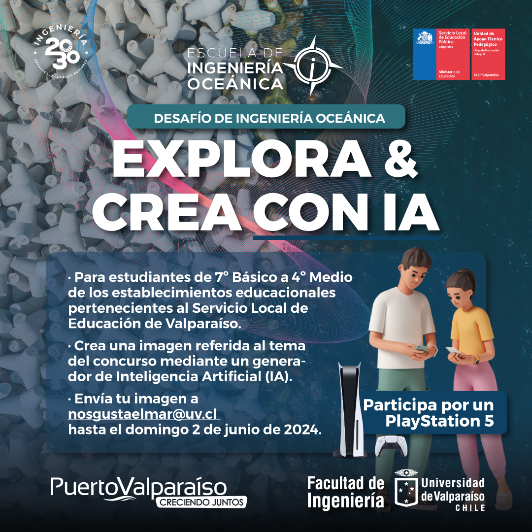 La carrera de Ingeniería Civil Oceánica UV en conjunto con la Empresa Puerto Valparaíso (EPV) presentaron el primer concurso Desafío Oceánico Explora & Crea con IA para estudiantes de séptimo básico a cuarto medio. El certamen tiene por objetivo promover el interés en fenómenos marítimos, costeros y portuarios, la creatividad y la exploración del arte generado por Inteligencia Artificial entre los estudiantes de colegios pertenecientes al Servicio Local de Educación Pública de Valparaíso (SLEP).