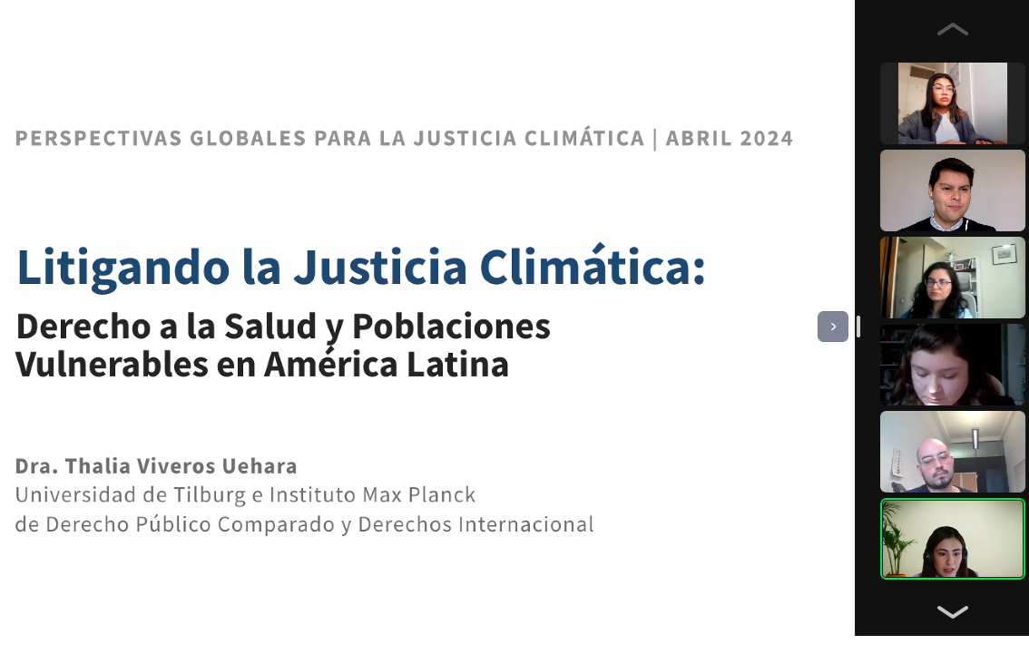 Thalia Viveros expuso sobre el Derecho a la Salud como herramienta normativa y analítica para la justicia climática. En este tenor, inició su presentación sobre la base de la posibilidad de encontrar justicia climática a través de los tribunales nacionales. Esto a raíz de que los litigios climáticos a partir de 2015 han ido en crecimiento, en especial en Latinoamérica.