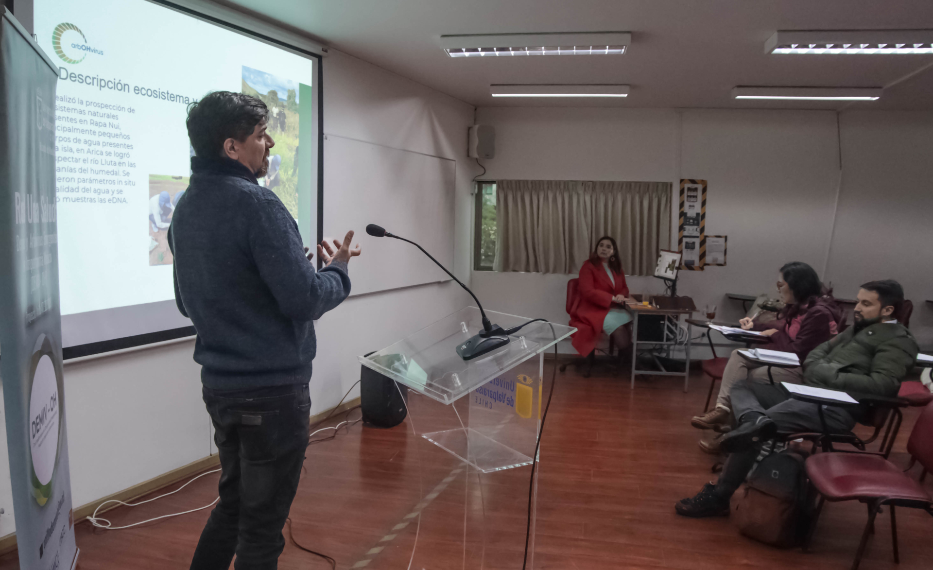 Tras su intervención, expusieron los investigadores principales Rodrigo Salas, quien habló de la evolución de las líneas de investigación, innovación y desarrollo tecnológico asociadas a la creación de la plataforma web de DEMIH-OH, y Daniela Figueroa, quien por su parte se refirió a las capacitaciones, talleres y jornadas realizadas hasta la fecha en Arica y Rapa Nui. También hicieron uso de la palabra los investigadores asociados Christian González y Sergio Scott, quienes a su vez entregaron un resumen de los avances que el proyecto exhibe en materia de muestreos entomológicos y análisis de aguas, respectivamente.