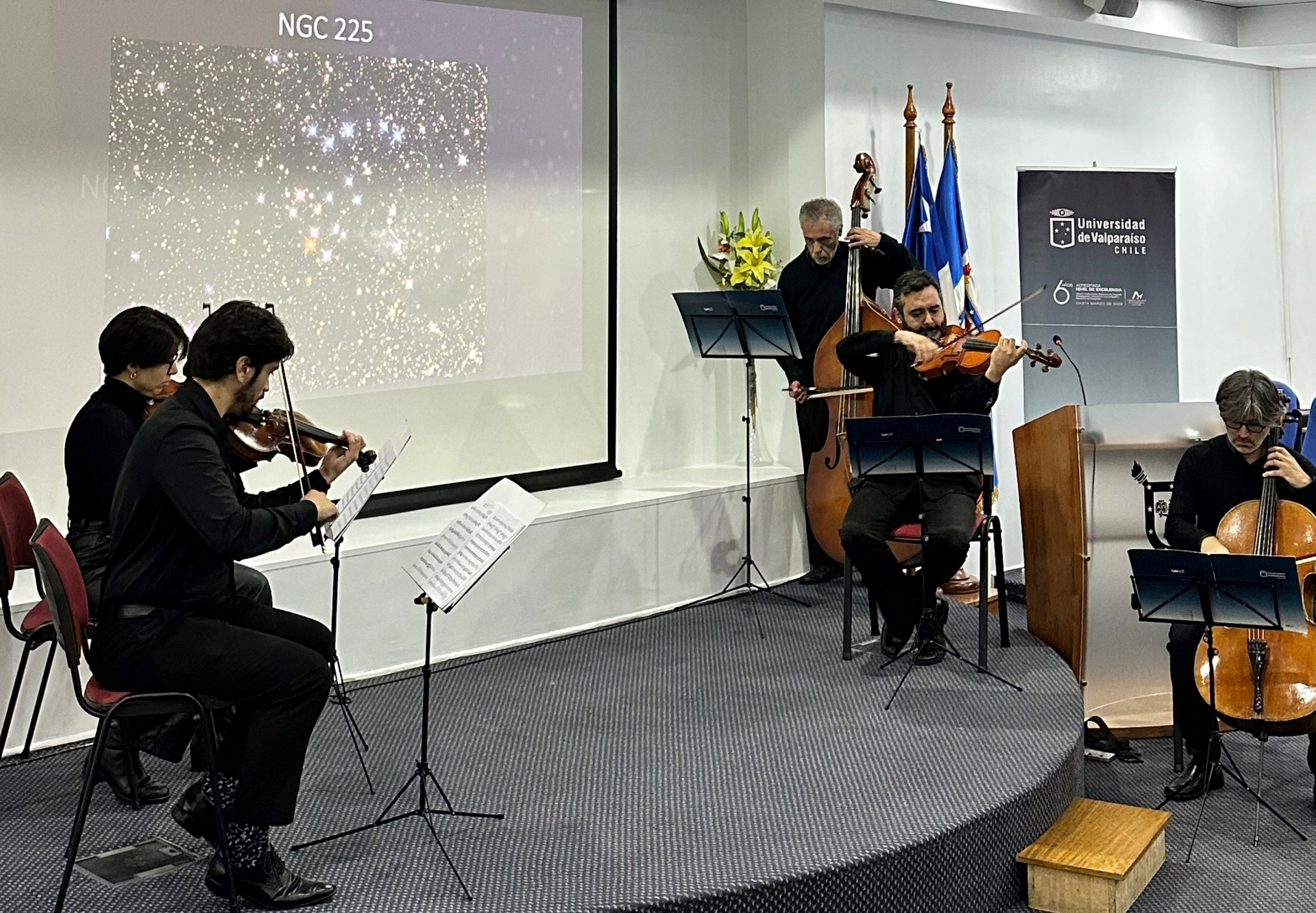 La música en vivo constituyó un aspecto innovador en el marco de estas jornadas. Y el protagonismo se lo llevó la Agrupación Musical de Cámara de la UV, que estuvo integrada por Catalina Droguett y Eduardo Vargas en violines, Sebastián Rojas en viola, Francisco Palacios en cello y Álvaro Toledo en contrabajo. El director Gonzalo Valencia destacó que “lo interesante de la conferencia del doctor Vogt es que fue acerca de uno de los pioneros de la astronomía moderna como también un músico y compositor profesional, sir William Herschel”.