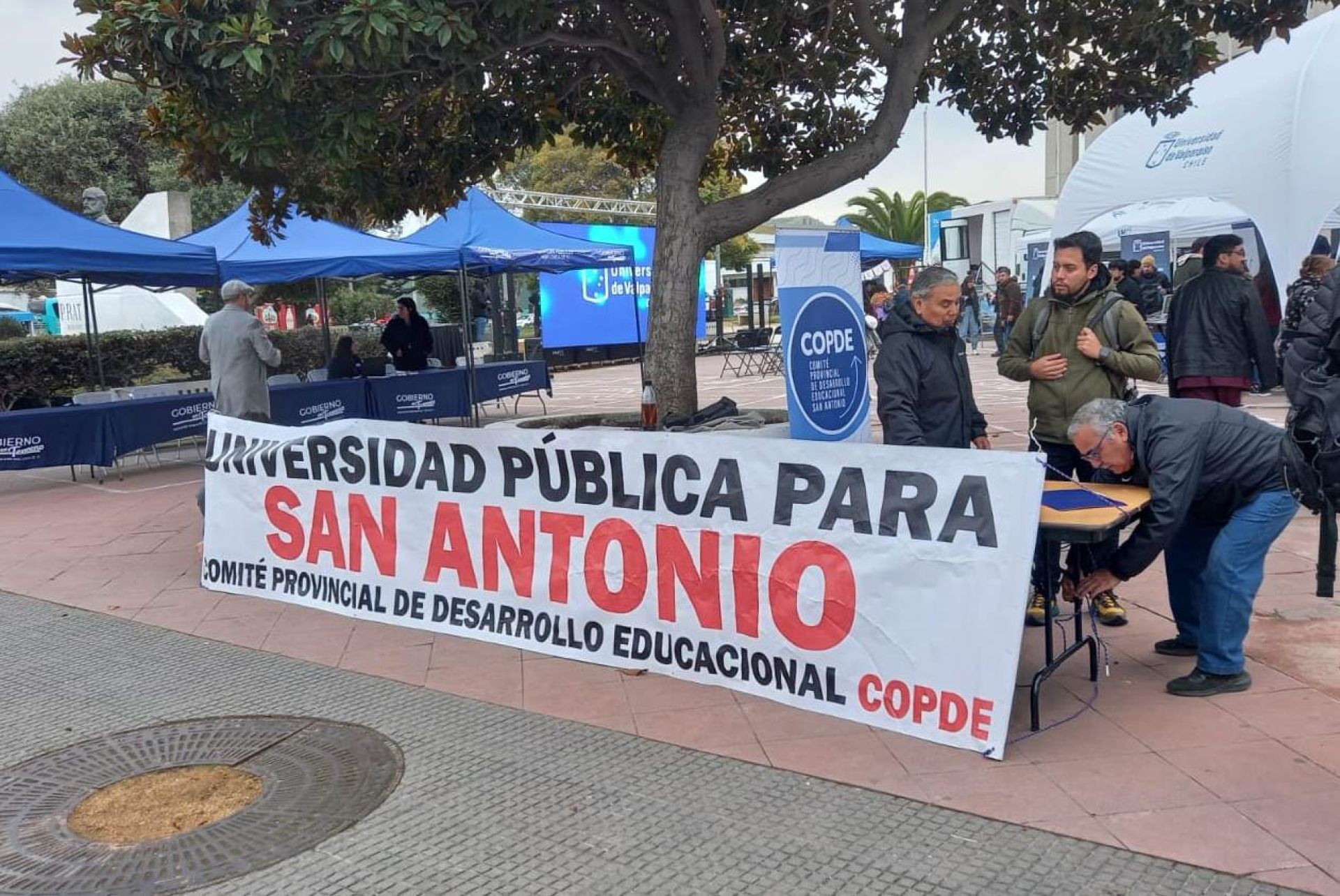 La primera imagen con la que se encontraron los visitantes de la feria Territorio UV el pasado viernes era un gran lienzo que el Comité Provincial de Desarrollo Educacional de San Antonio desplegó y que pedía que se instale una universidad pública en el puerto. Los encargados del comité explicaron que ya han recolectado alrededor de ocho mil firmas apoyando la iniciativa de que la Universidad de Valparaíso instale un campus en San Antonio, pero no solo la sociedad civil está comprometida con este proyecto: también autoridades de la zona han manifestado en más de una ocasión su total apoyo a la iniciativa y en la feria de servicios realizada la semana pasada volvieron a hacerlo.