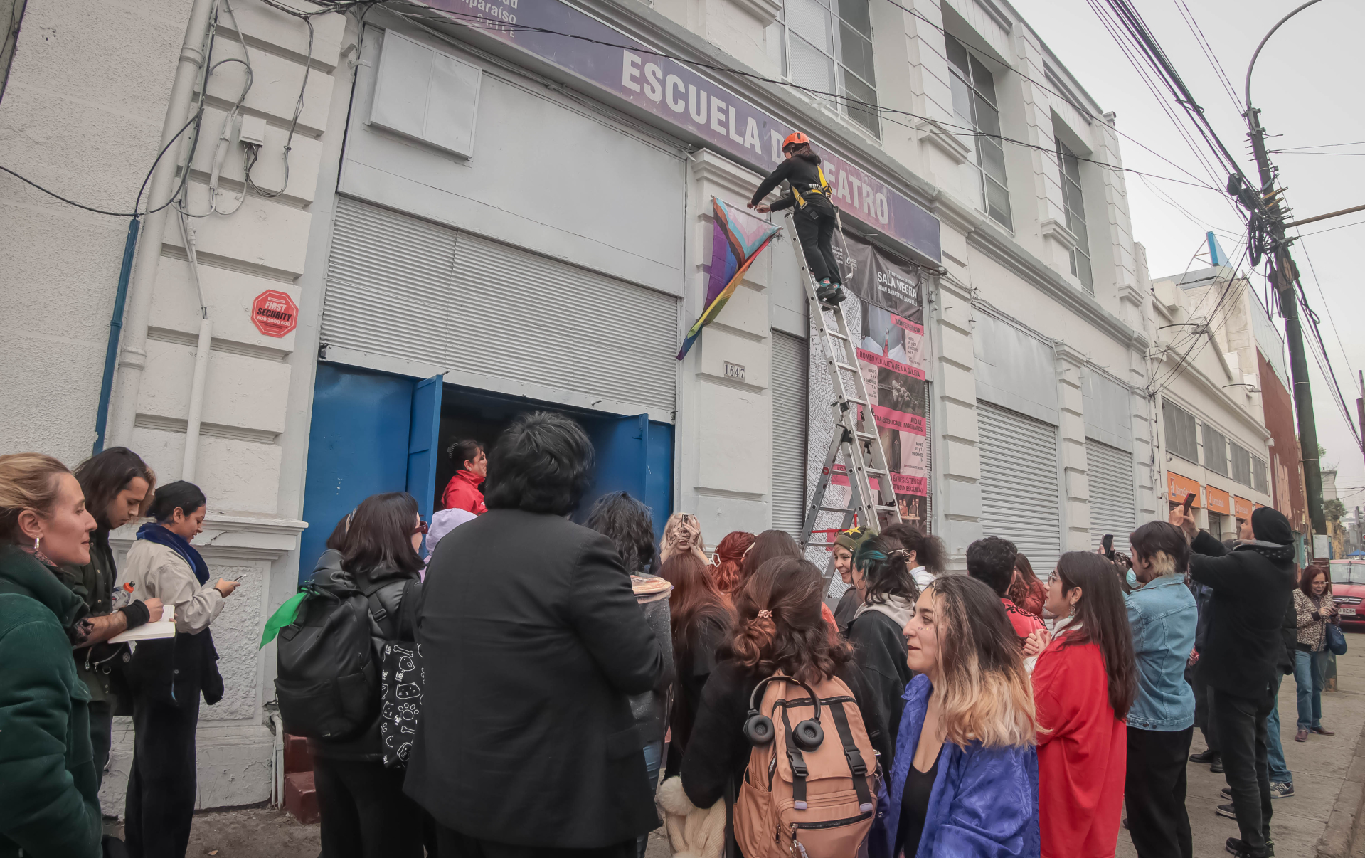 Estudiantes de Teatro UV instalan banderas LGBTIQANB+ y no binaria en frontis de la Escuela