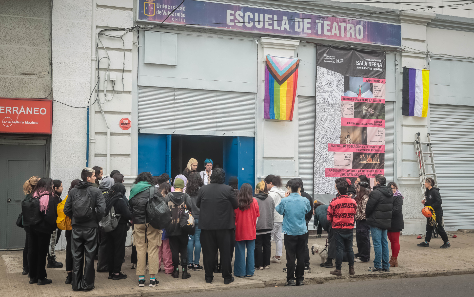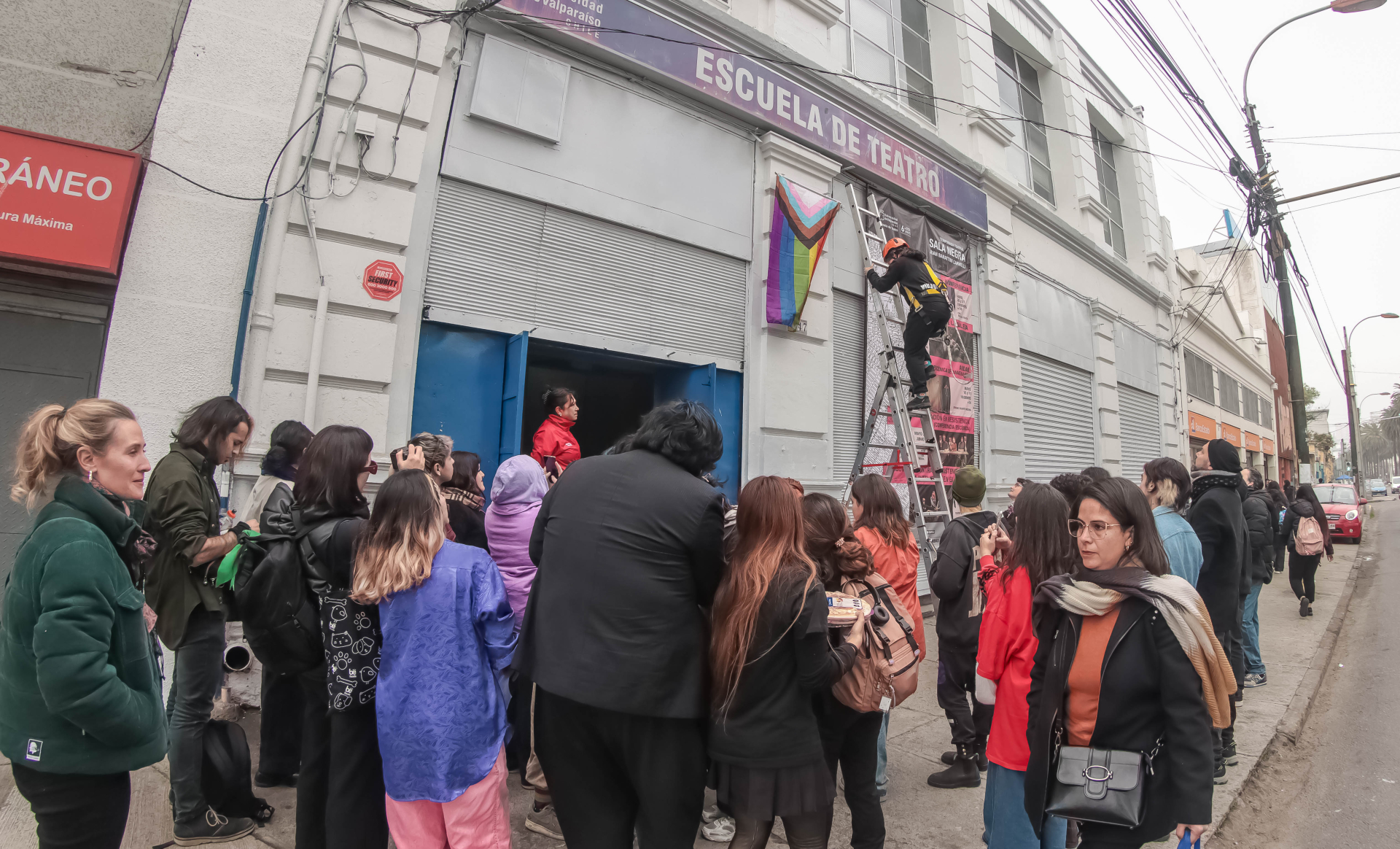 Por tercer año consecutivo, los estudiantes de la Escuela de Teatro UV salieron a la calle para instalar las banderas LGBTIQANB+ (Lesbiana, Gay, Bi, Trans, Inter, Queer, Asexual, No Binario) y la No Binaria en el frontis de la unidad académica ubicada en avenida Brasil 1647, Valparaíso. La acción, que se realiza cada primer martes de junio, busca dar inicio a la conmemoración del Mes del Orgullo LGBTIQANB+.