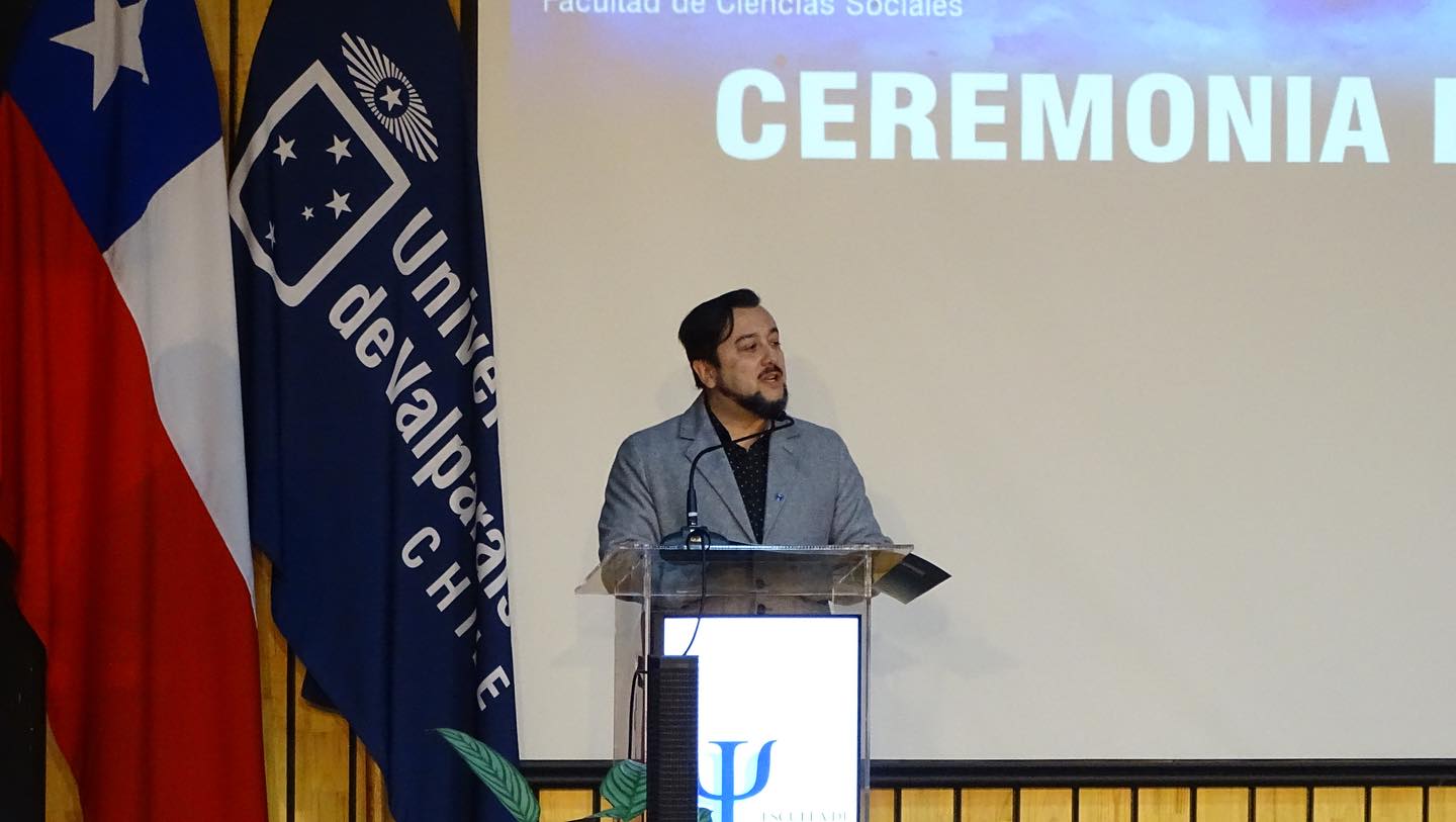 La ceremonia comenzó con la interpretación del himno universitario “Gaudeamus Igitur”, a cargo de la Agrupación Musical de Cámara de la Universidad de Valparaíso, que fue seguida por las palabras del director de la carrera, Carlos Varas, quien brindó aliento y reflexión a nuestros egresados para el inicio de sus carreras profesionales.