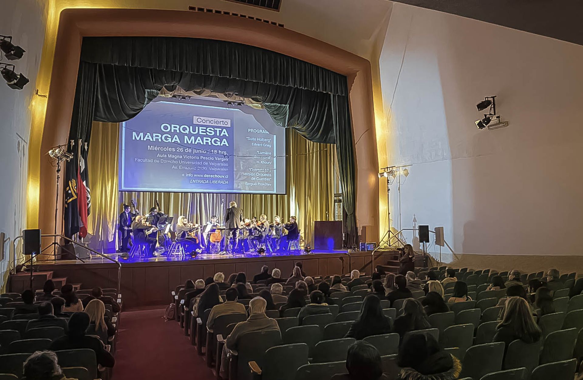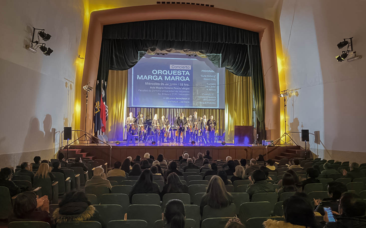 La Facultad de Derecho de la Universidad de Valparaíso albergó el concierto de la Orquesta Marga Marga, evento con el cual la unidad académica dio cierre a las actividades musicales del primer semestre, luego de un total de cuatro recitales llevados a cabo en el Aula Magna Victorio Pescio Vargas.