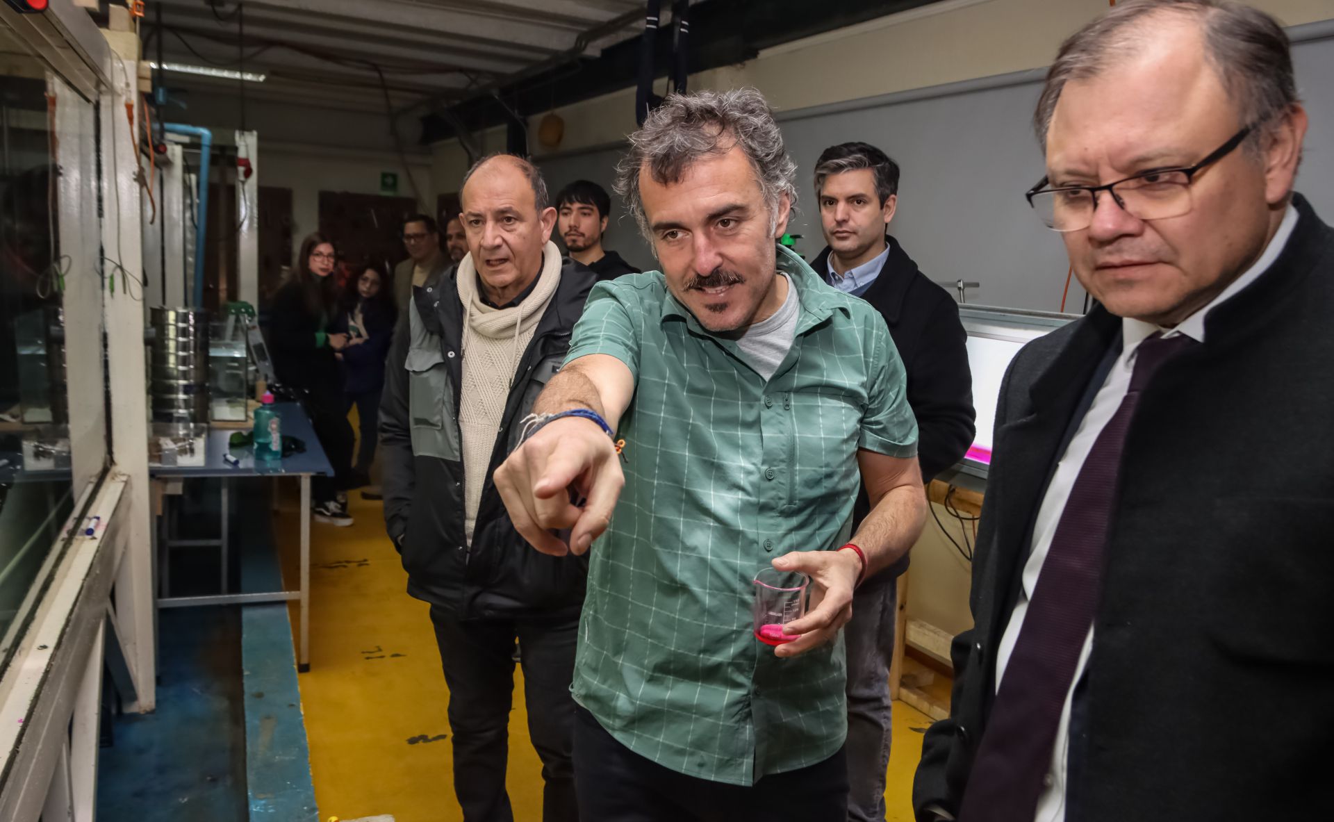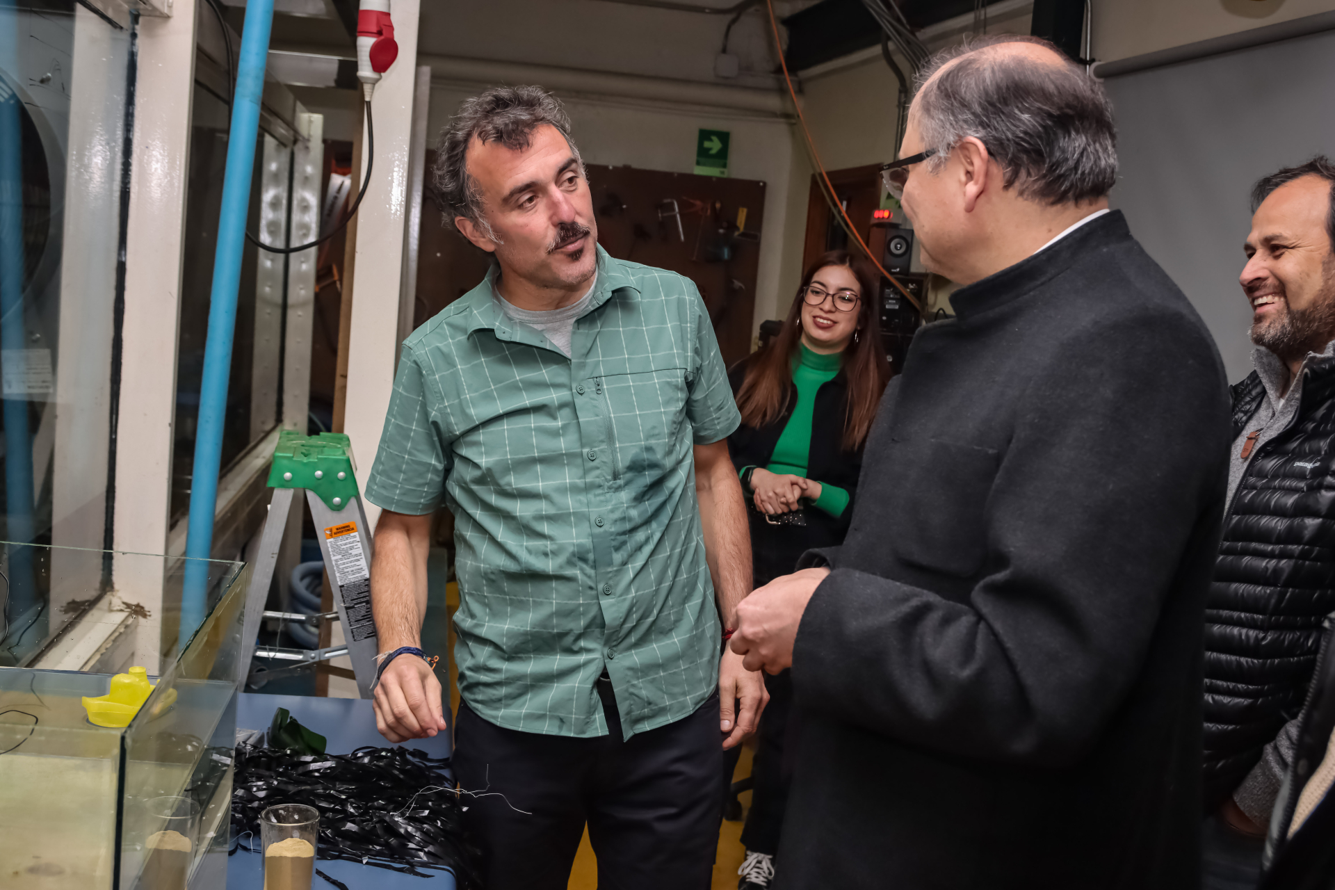 El rector UV Osvaldo Corrales visitó el Labocéano de la Escuela de Ingeniería Oceánica, para conocer en detalle el avance de dos proyectos Fondef sobre el impacto de la desalación en el medio marítimo y la creación de un prototipo de un bosque de algas para disipar la energía del oleaje, ambos a cargo del académico Patricio Winclker.