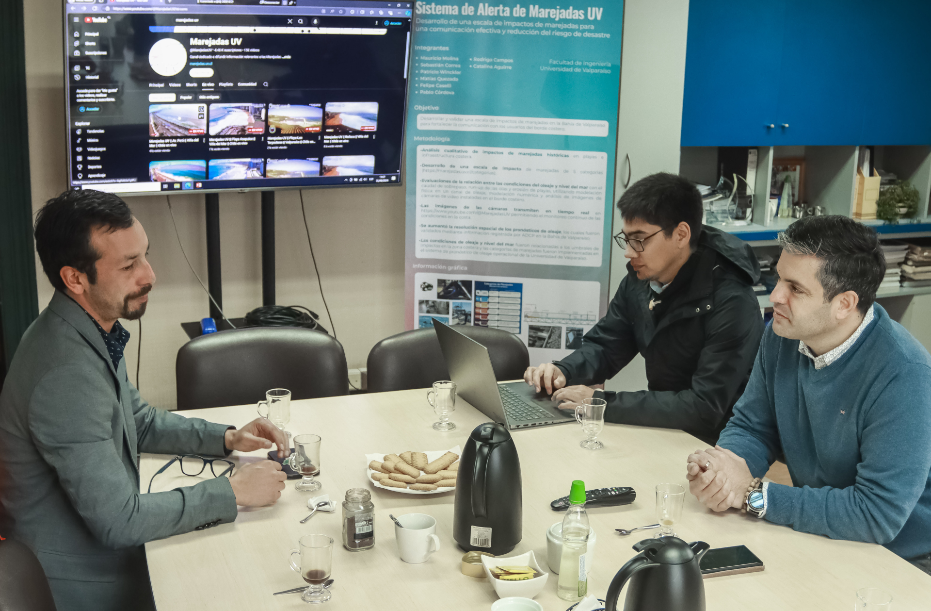 En la oportunidad, fue recibido por Felipe Caselli, director de la Escuela; Sebastián Correa, director del Sistema de Alerta de Marejadas, y Cecilia Inostroza, encargada de Vinculación con el Medio de la Facultad de Ingeniería.