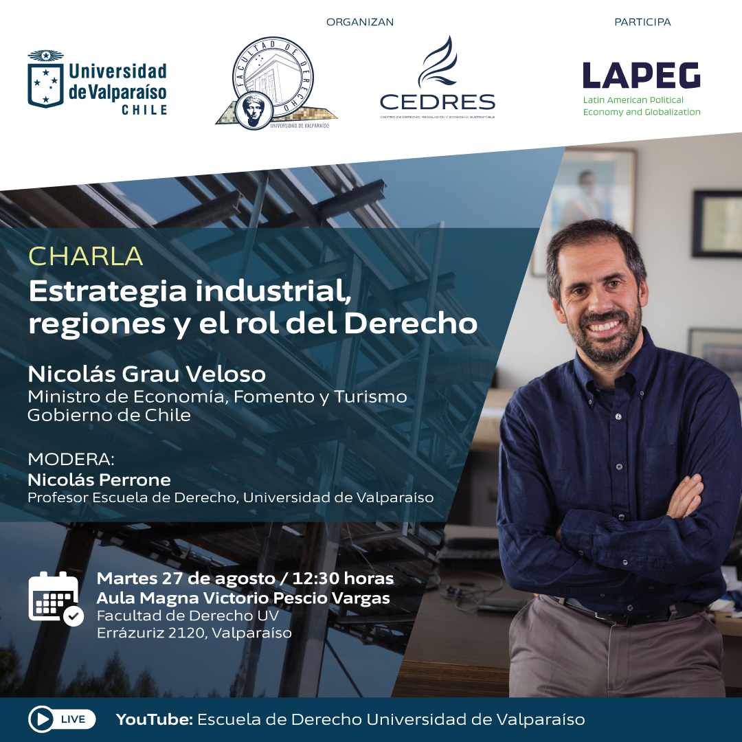 El ministro de Economía, Fomento y Turismo del Gobierno de Chile, Nicolás Grau Veloso, visitará la Universidad de Valparaíso el martes 27 de agosto. En la oportunidad, será parte de un diálogo en torno a la temática “Estrategia industrial, regiones y el rol del Derecho” junto al profesor del departamento de Derecho Económico y Tributario de la Escuela de Derecho de la Universidad de Valparaíso, Nicolás Perrone.