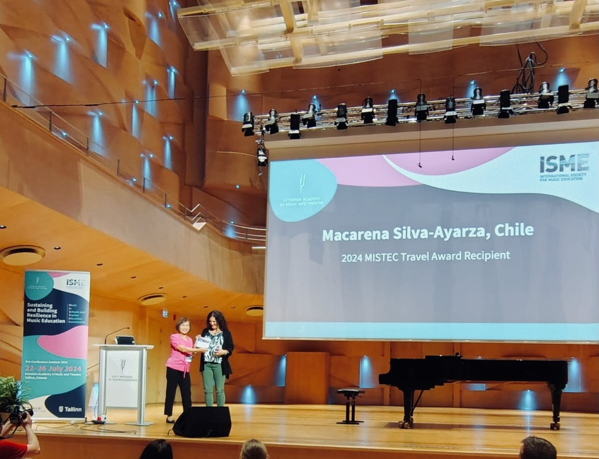 La profesora Silva Ayarza recibió en Estonia el premio MISTEC Travel Award, que se entregó únicamente a tres expositores del congreso. “Este reconocimiento a mi trabajo significó, además de un aporte económico importante para poder viajar, un refuerzo a mi confianza académica y un impulso a seguir trabajando con fuerza para transformar la educación musical a través la formación de profesores y profesoras”, señala.