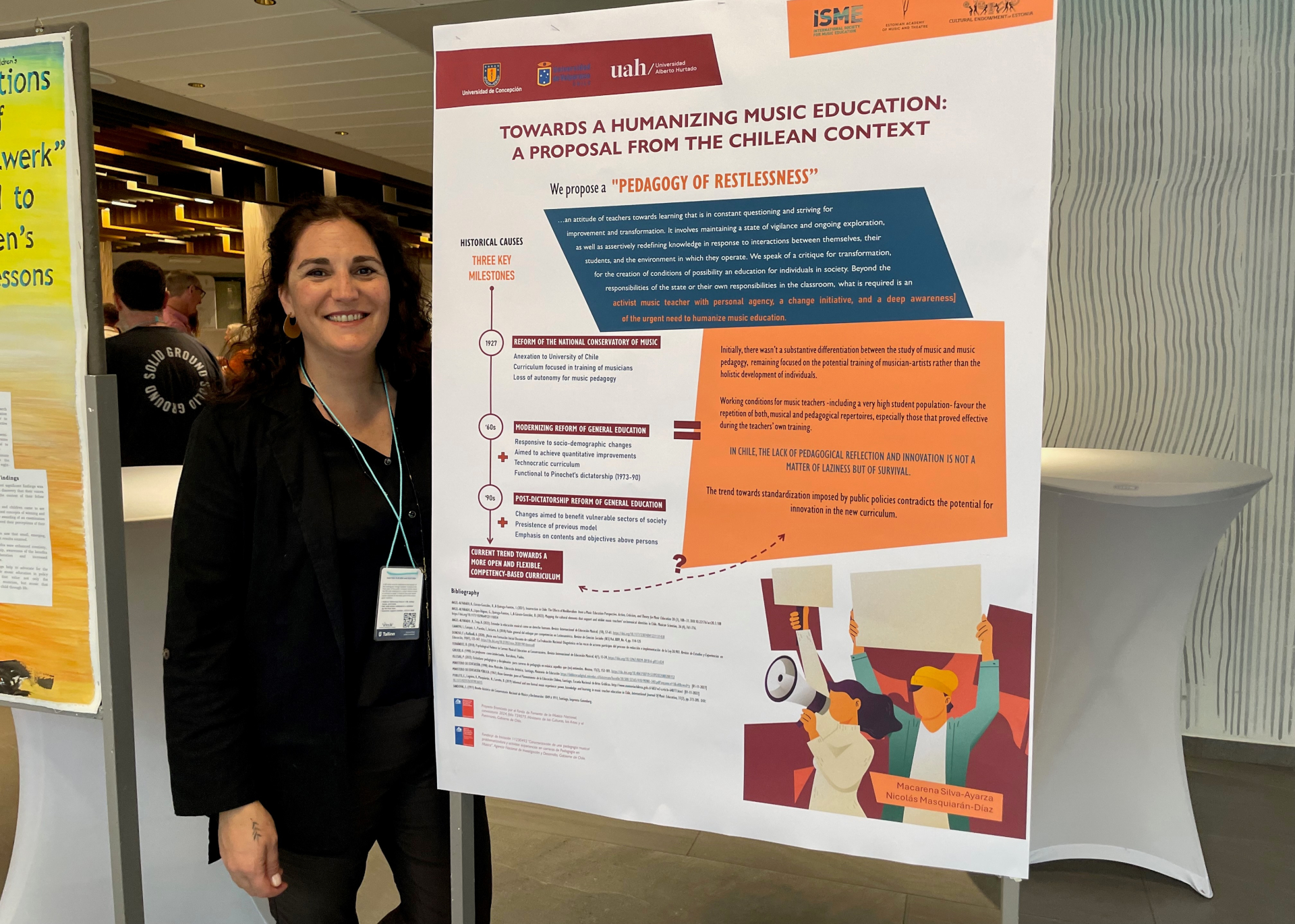 Respecto de estas instancias, señala Macarena Silva: “Como equipo Fondecyt y en relación a la temática de nuestro proyecto, postulamos a la Pre Conferencia (MISTEC) y la Conferencia Mundial (ISME) y quedamos seleccionados para presentar en ambas instancias. En MISTEC, además de presentar una ponencia los tres investigadores, con el coinvestigador quedamos seleccionados para presentar un póster sobre el desarrollo histórico del currículum nacional de educación musical y su análisis crítico. En el desarrollo del paper que llevó al póster desarrollamos el concepto ‘Pedagogía de la Inquietud’, que fue muy bien recibido por los académicos a nivel internacional”.
