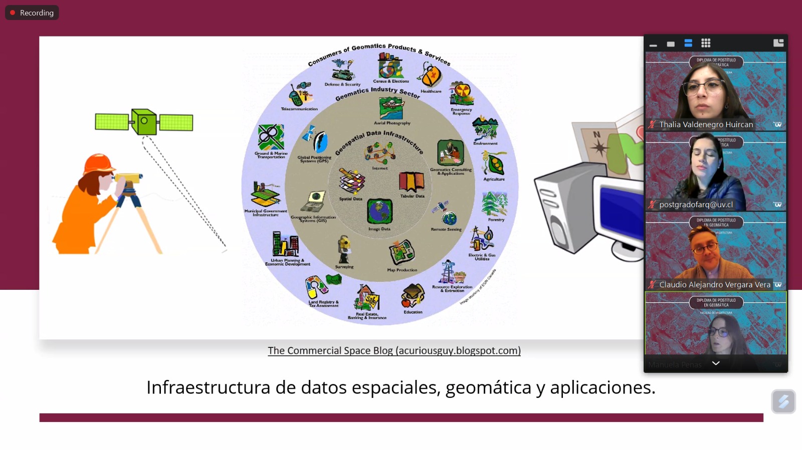 La expositora Manuela Penas comentó que “se trató de una introducción a los conceptos generales de la geomática, revisando la construcción del concepto, cómo se originó, de qué se deriva, cuáles son las disciplinas y tecnologías que la sustentan, los cuales corresponden a las estructuras de los módulos del programa”.