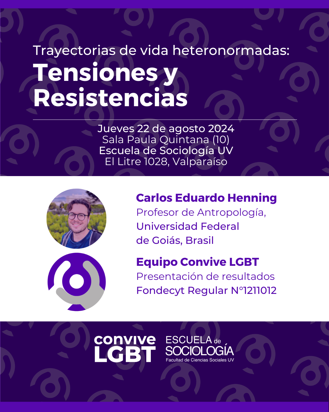 En la Escuela de Sociología UV, ubicada en subida El Litre, se desarrollará el jueves 22 de agosto el seminario “Trayectorias de vida heteronormadas: Tensiones y resistencias”, actividad organizada por el proyecto Convive LGBT. En la ocasión, expondrá el invitado internacional Carlos Eduardo Henning, profesor de Antropología de la Universidad Federal de Goiás, Brasil, especialista en estudios de Género y Sexualidad, Antropología Cultural, Gerontología y Estudios Intergeneracionales.