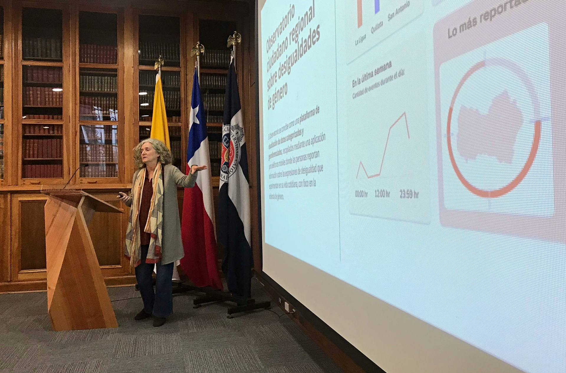 La reunión continuó con la exposición de la doctora Alessandra Olivi, académica de la Escuela de Sociología de la Universidad de Valparaíso, quien estuvo a cargo de dar a conocer los avances en el desarrollo de la aplicación móvil “Te Appaño”, para el reporte de situaciones de violencia de género.