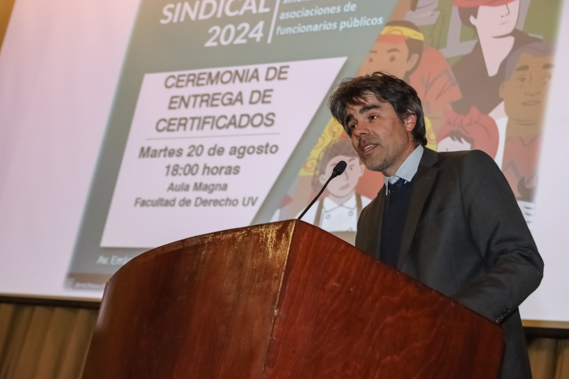 Asistieron además Jesús Figari, director regional del Trabajo de Valparaíso; Maycol Gómez, director regional del Instituto de Seguridad Laboral; integrantes de las Escuelas Sindicales de la Universidad de Valparaíso, Universidad de Chile, Pontificia Universidad Católica de Valparaíso y Universidad Alberto Hurtado; profesores del Departamento de Derecho del Trabajo y Seguridad Social de la UV, y egresados y egresadas de la Escuela Sindical 2024 junto a familiares y amigos.