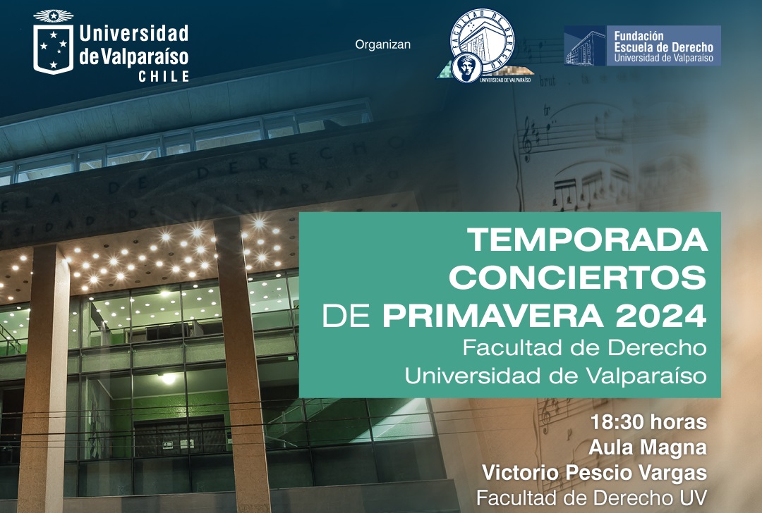 La Temporada de Conciertos de Primavera 2024 es organizada por la Facultad de Derecho de la Universidad de Valparaíso en conjunto con la Fundación Escuela de Derecho, y producida por MG Medios. Cuenta con el patrocinio del Centro de Exalumnos y Amigos de la Escuela de Derecho de la UV, Agunsa, Grupo GEN y Compañía Marítima Chilena S.A., y la colaboración de Coopeuch.