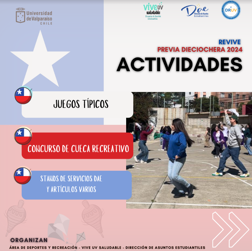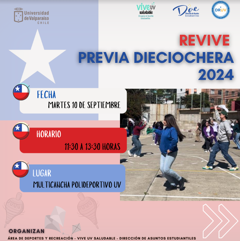 Revive – Previa Dieciochera es la jornada con que el Área de Deportes y Recreación y el Programa Vive UV Saludable, ambos dispositivos de la Dirección de Asuntos Estudiantiles, invitan a la comunidad de la Universidad de Valparaíso a celebrar las Fiestas Patrias 2024. La actividad se realizará el próximo miércoles 10 de septiembre, de 11:30 a 13:30 horas, en las dependencias del Gimnasio Polideportivo, avenida El Parque 627, Playa Ancha.