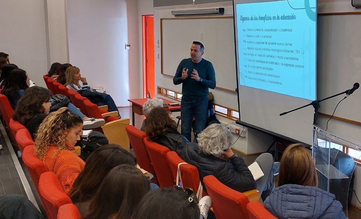 Durante su presentación, el docente de la Universidad CEU Cardenal Herrera dio cuenta de la importancia de la educación musical como eje integral y de bienestar en los procesos de enseñanza y aprendizaje, al tiempo que resaltó su condición de elemento fortalecedor de la creatividad.