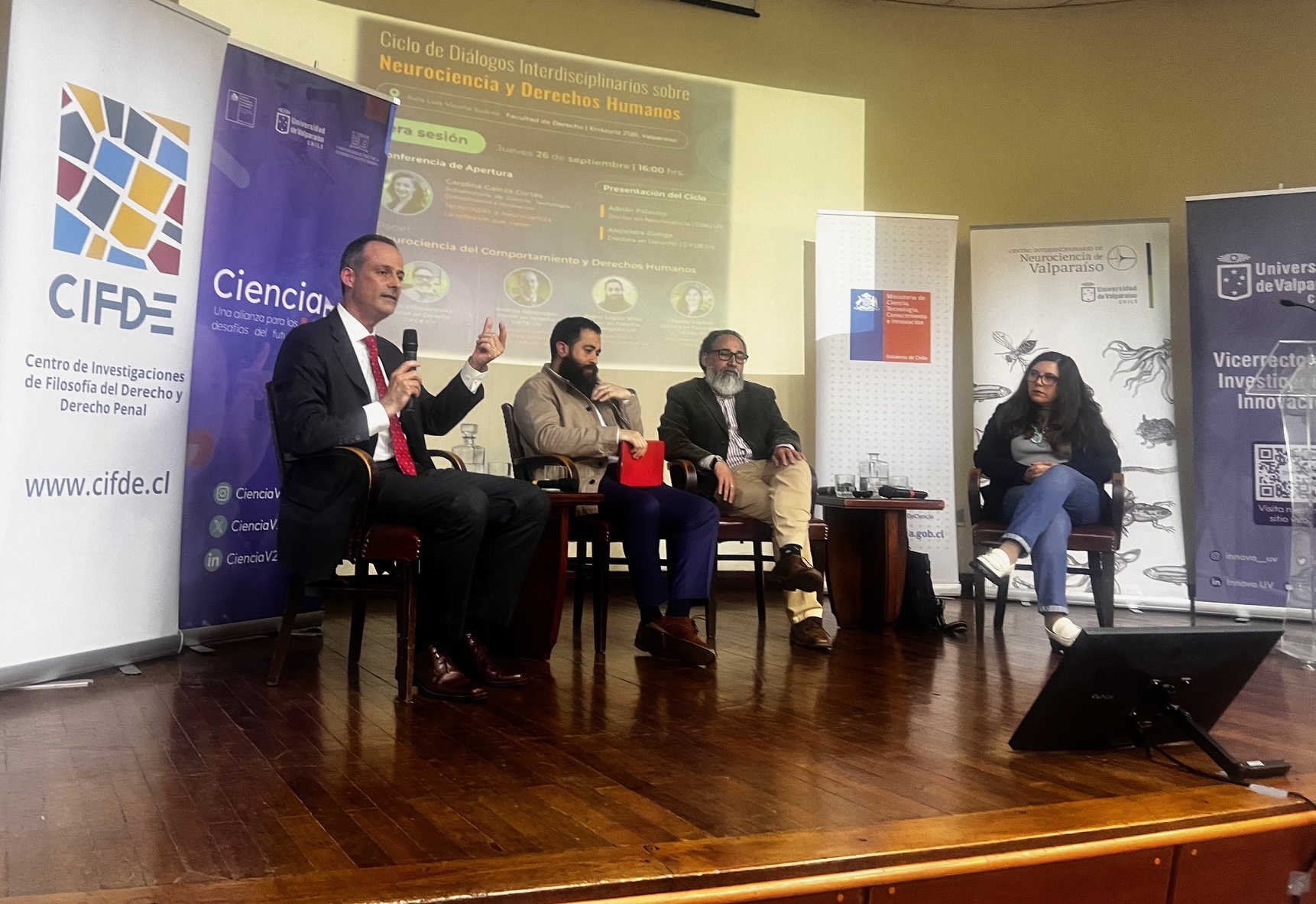 Durante la primera sesión, se llevó a cabo el conversatorio “Neurociencia del comportamiento y Derechos Humanos”, en el que participaron Andrés Benavides, doctor en Derecho e investigador del CIDFE-UV, quien presentó el tema “Imputación penal y neurociencia: comentarios a un caso judicial”; Pablo López-Silva, psicólogo y doctor en Filosofía de la Universidad de Valparaíso, con su exposición “Determinismo, voluntarismo y neuroética”; y Fanny Leyton, psiquiatra y doctora en Psicoterapia del CIESAL-UV, quien abordó el tema “Neurociencia y juicio moral”. El debate fue moderado por el profesor Luis Villavicencio.