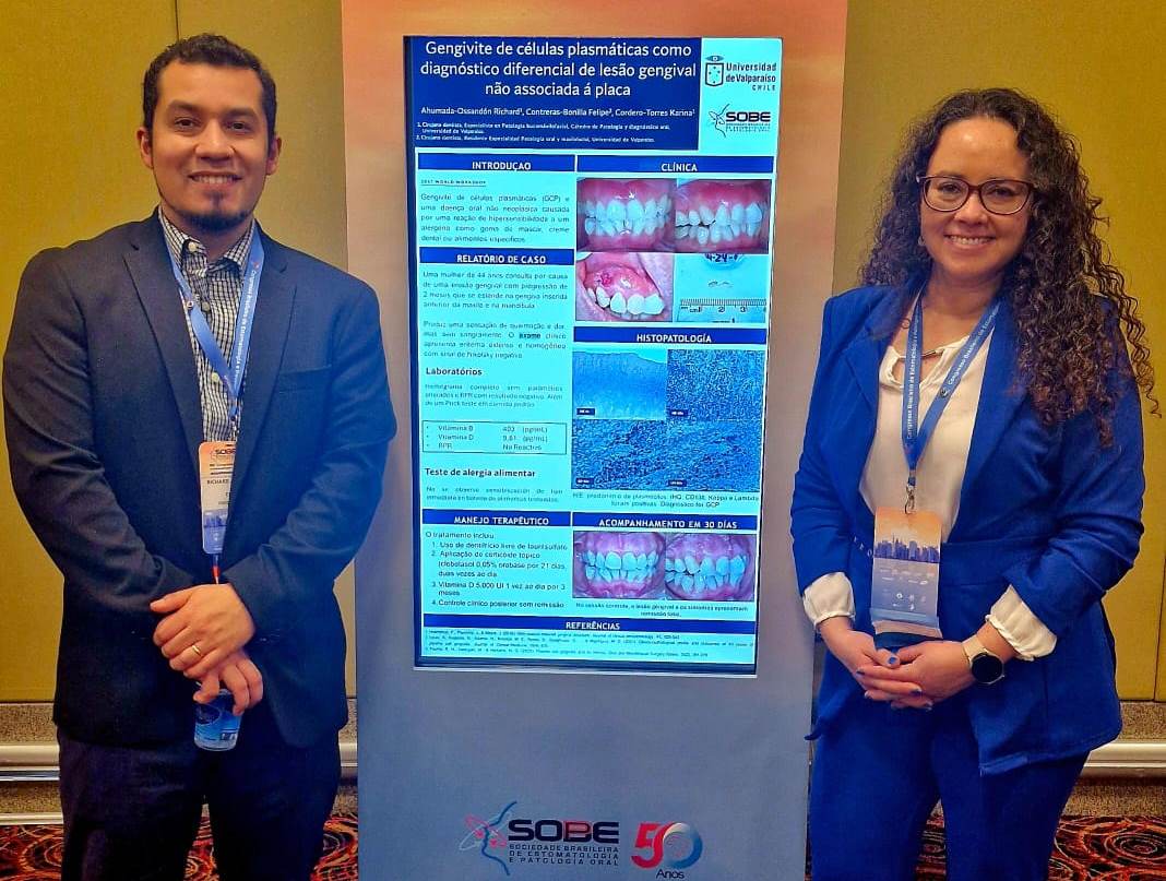 Por su parte, el doctor Richard Ahumada desempeñó un doble rol en el congreso, presentando un póster sobre un caso clínico desarrollado en la Especialidad de Patología y Medicina oral de la UV junto a la doctora Cordero y el residente Felipe Contreras, además de actuar como jurado en la evaluación de pósteres científicos, intercambiando experiencias con colegas brasileros.