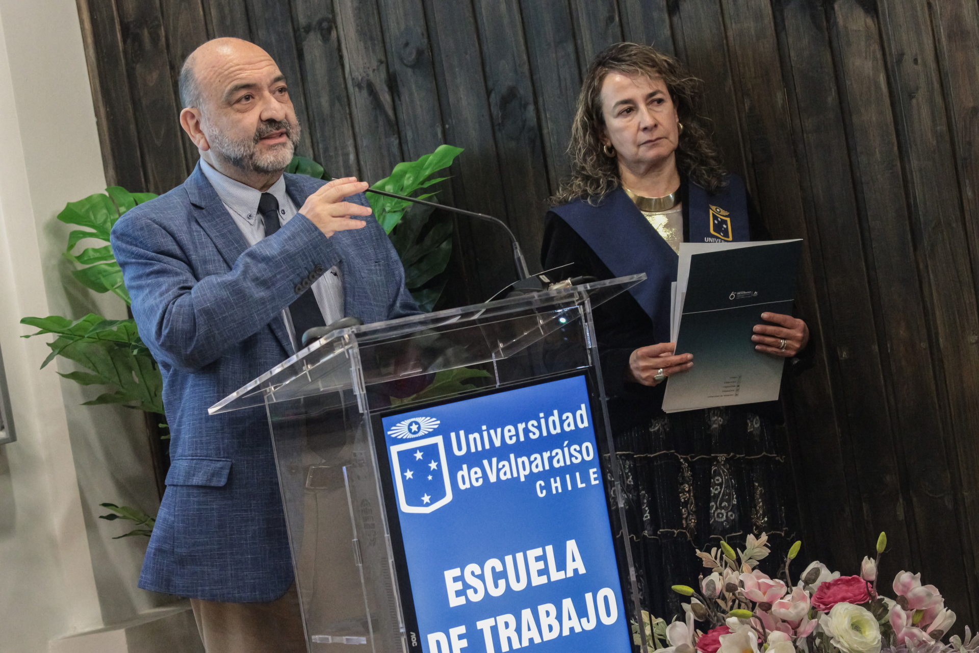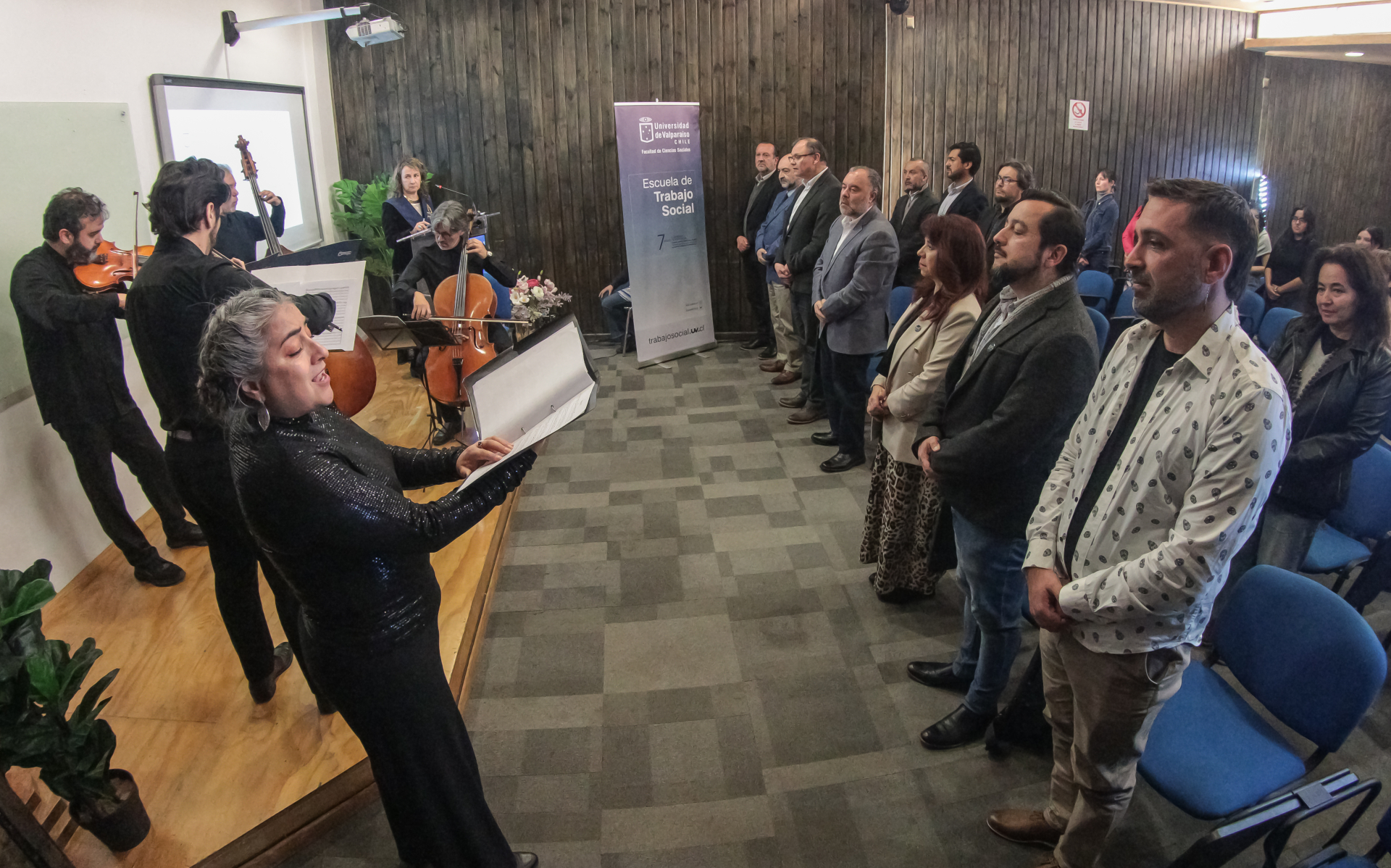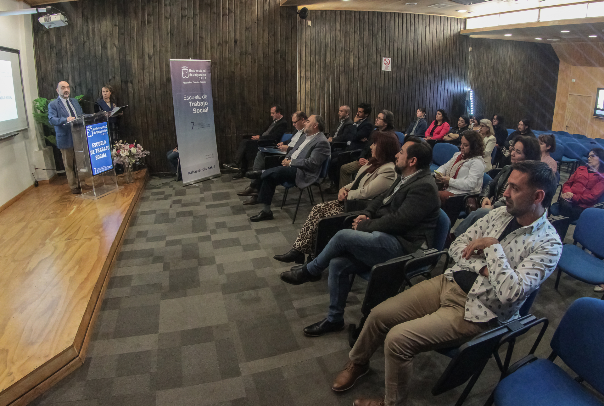 El acto fue encabezado por el rector de la UV, Osvaldo Corrales, quien estuvo acompañado por el decano de la Facultad de Ciencias Sociales, Gonzalo Lira; la vicedecana, Cecilia Concha, y el director de la Escuela de Trabajo Social, Mauricio Ureta. Asistieron además el director de la Escuela de Psicología, Carlos Varas; representantes del Centro de Estudiantes de Trabajo Social, y académicas, académicos, funcionarias, funcionarios, egresadas, egresados, empleadoras y empleadores.