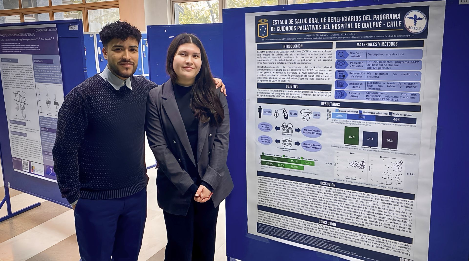 En el marco del XV Congreso Internacional "Rehabilitación Oral, Implantología y Armonización Orofacial", los estudiantes Sebastián Suárez y Marcela Segura, de sexto año de la Escuela de Odontología de la Universidad de Valparaíso, lograron un importante reconocimiento al obtener el primer lugar en la categoría de Trabajo de Investigación. Bajo la dirección del doctor Jorge Godoy y en colaboración con el profesor Miguel Ángel Parra como cotutor, presentaron su póster que aborda la salud oral de pacientes en cuidados paliativos, destacando la importancia de su investigación en el contexto de la salud pública y el bienestar de esta población vulnerable.